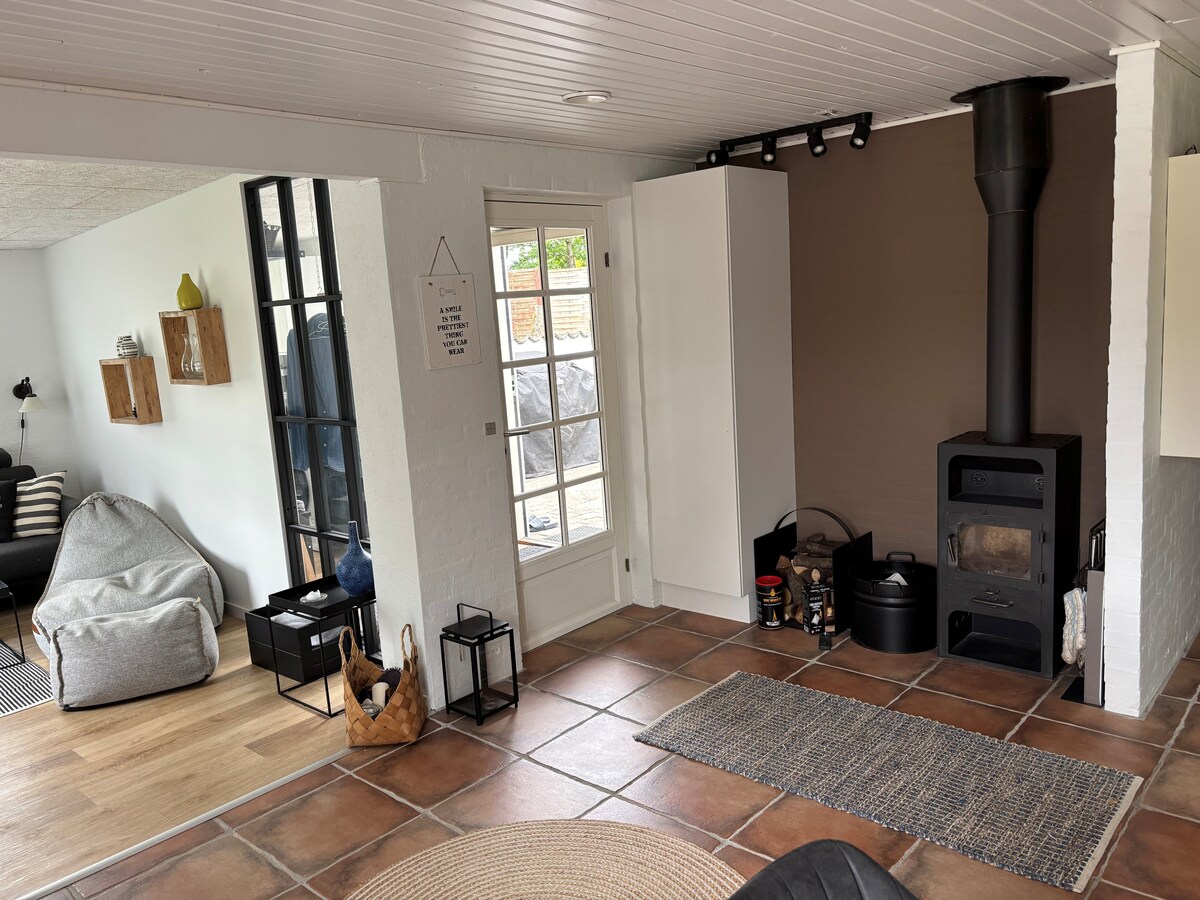 Cozy cottage in Øster Hurup close to town and water 1200 meters to shopping and 400 meters to the sea Enjoy your vacation in this cozy gem, which exudes tranquility, a good atmosphere for relaxation and coziness. Here, the good times can be enjoyed, both outside and inside Newly renovated and nice space for 4 - people - 3 bedrooms (1 x double bed, 1 x 3/4 bed and small room with a single bed) heated with heat pump and wood-burning stove There is an outdoor wilderness bath - wood-fired Good terraces with both morning sun/evening sun