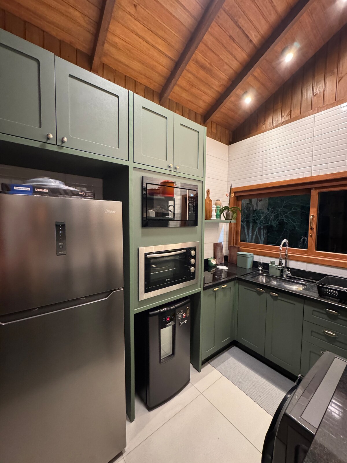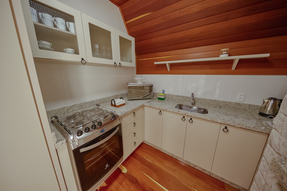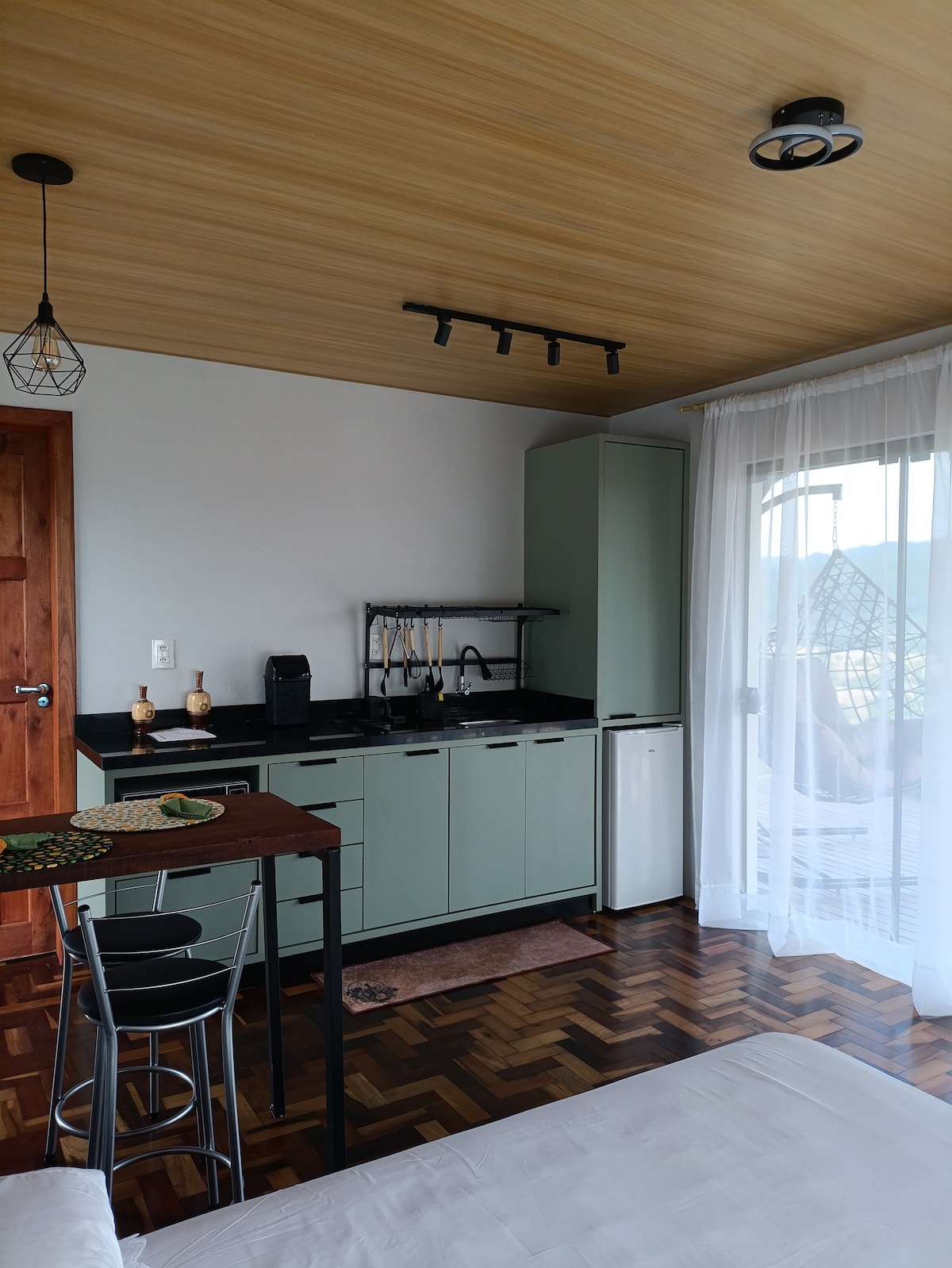 Cabana Coqueiro is the ideal retreat for those who want to rest surrounded by nature, with all the necessary comfort. It accommodates up to 3 people, with a double bed and a single bed, plus a private bathroom. The cabin has Wi-Fi, TV and a full kitchen. Outside, the balcony with a barbecue deck and lovely view. At Sítio D'Maria, you can also take the opportunity to walk to the lake, fish, we have animals such as geese, swans and cows. And also an infinity swing.