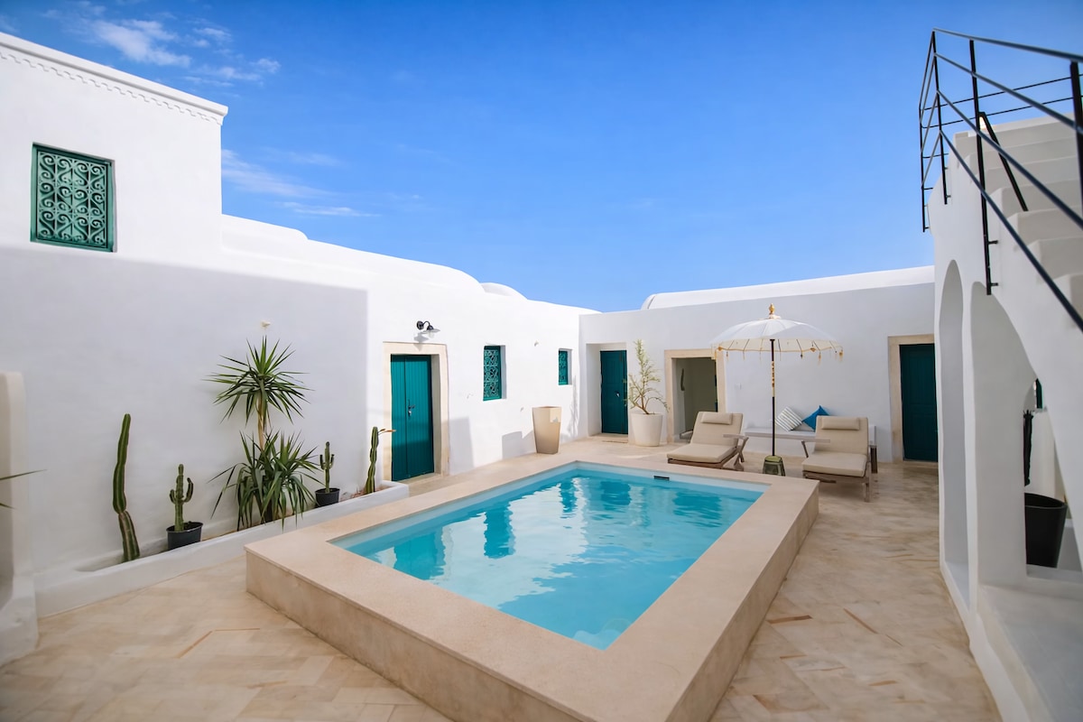 A Djerbian house dating back to 1768, restored with passion to offer an unforgettable experience. Immerse yourself in a world where historic charm meets modern comfort. It houses four suites, each imbued with its own character. Guests can relax in the sparkling pool, gather in the reception area, or escape to the vast garden. A barbecue area invites you to evenings under the stars, while an outdoor terrace offers stunning views.