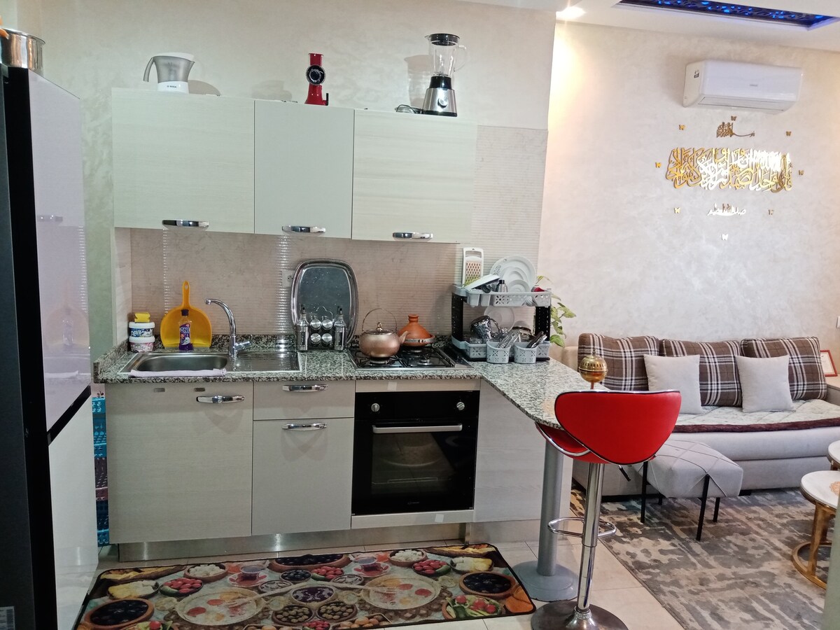 Offrez-vous un régal en séjournant dans cet appartement lumineux et moderne ! Tout est confortable dans cet appartement, les œuvres d'art et le décor en dit long sur la beauté ! Vous et votre famille ou vos amis pouvez profiter l'un et l'autre sans vous sentir à l'étroit ! si vous respirer de l'air frais tout en dégustant une tasse café/Thé pendant la journée tout en profitant de la vue paisible que cet appartement a à offrir. c'est votre maison loin de chez vous lorsque vous explorez Agadir.