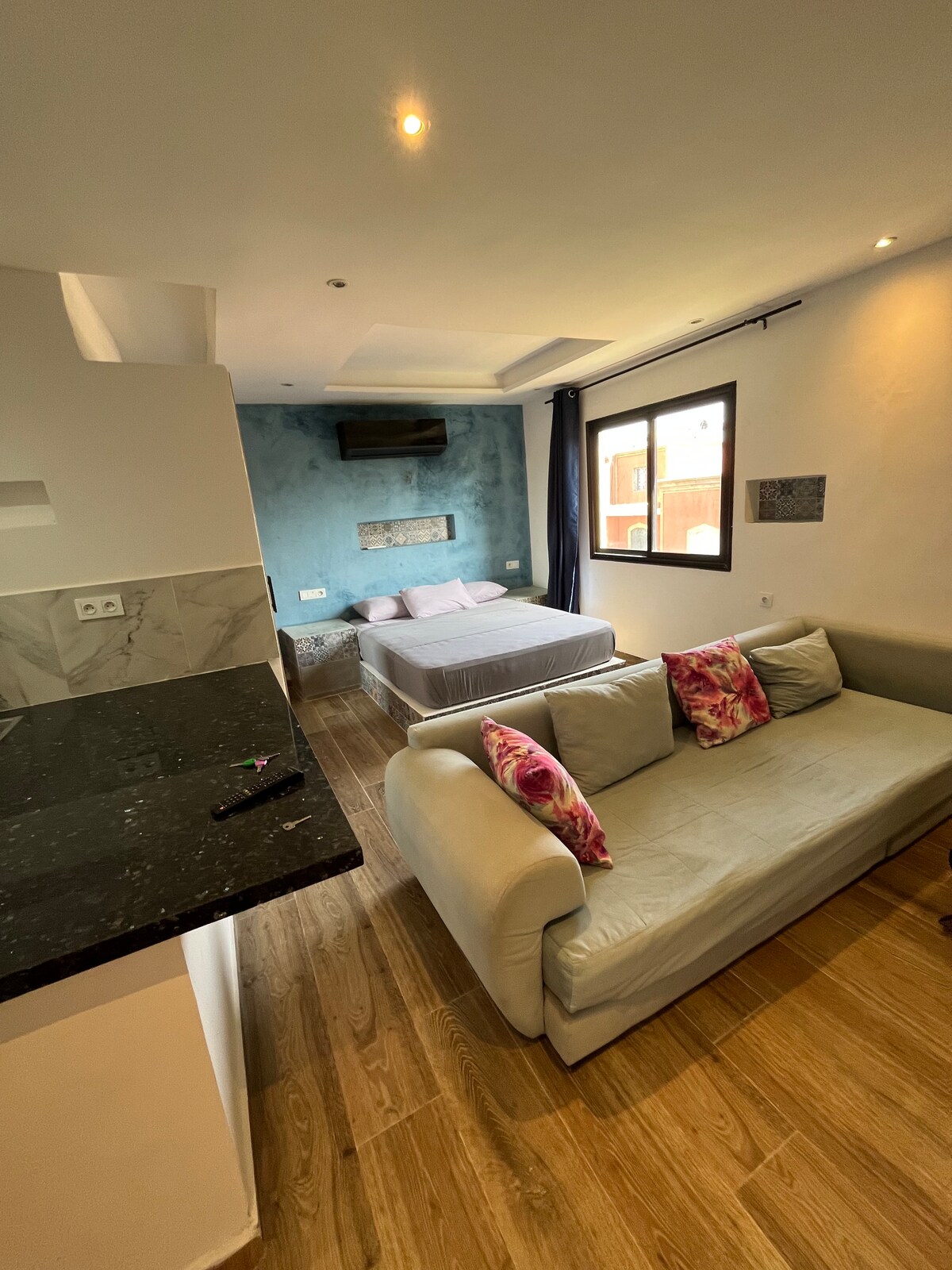 Découvrez le confort dans ce magnifique studio climatisé où tradition et modernité se fondent harmonieusement. Ce studio, comprenant une chambre et une salle de bain, est idéalement situé, dans le quartier de Gueliz à quelques pas de cafés, restaurants, et autres lieux de divertissement. pour une immersion totale dans l’atmosphère unique de Marrakech. Medina - 11 min 🚗 Jemaa el-Fna - 10 min 🚗 Aéroport - 12 min 🚗 Jardin Majorelle - 10 min 🚗 M Avenue 8 min 🚗 Gare de Marrakech 3 min 🚗