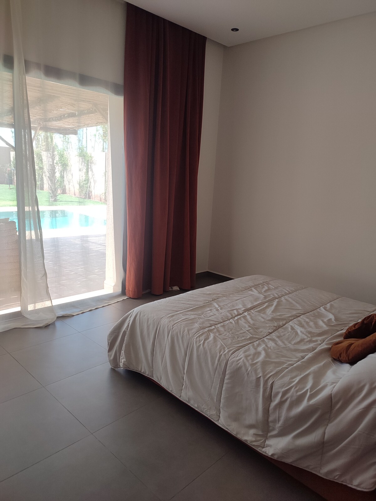 Beautiful villa for rent with pool, not overlooked, at the Orangeraie de Dyar Shemsi. 3 rooms: Living room, open kitchen, two bedrooms, bathroom, patio, two terraces, large garden. The villa is located in a secure estate 35 minutes from Agadir! Available in the residence: - Gym - Tennis court - Golf driving range - Ping pong table - Shared pool - Beauty salon - Groceries -Bookshelf - Multiple lakes - Walking - Free golf cart service