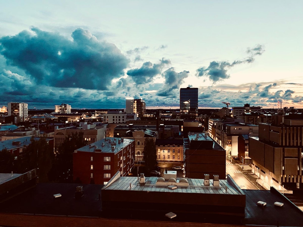 Tässä sinulle ainutlaatuinen ylimmän kerroksen upea kalustettu saunallinen kaksio huikealla paikalla Oulun Keskustan tuntumassa. Sähköauton lataus 10€/vrk. Uniikki, asuntoa leveämpi kattoterassi etelän suutaan on auringonpalvojan unelma. Isot ikkunat ja iso liukuovi parvekkeelle antaa mukavasti tilan tuntua. Modern apartment accommodates 1-5 adults in central Oulu. All services within a walking distance. Free parking. Families with kids warmly welcome! Great outdoor opportunities. EV charging