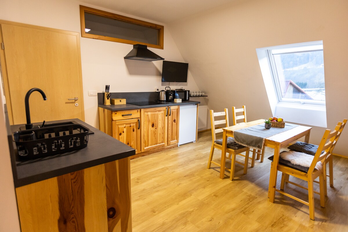 The apartment is located in a separate building in the yard of a secluded farm in the unspoiled nature of Pohorje. From the village of Mislinja, you ascend slightly to the homestead along a 1 km private macadam road. In the surrounding area you can walk through the mighty Pohorje forests and plains, cycle along countless forest roads and paths, climb in the nearby granite climbing area, explore the karst caves Hude luknje or relax in the local natural pool.