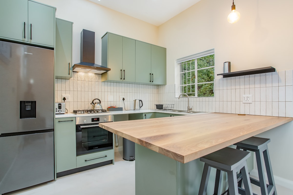 Our free standing stylishly renovated cottage is situated at the back of the property and has it’s own private garden courtyard. Fully equipped modern kitchen, living room, bedroom with skylight, Q-XL bed & en-suite bathroom. The cottage has AC, Wifi, smart TV (Netflix, Prime vid), an alarm and 24 hr patrol vehicle in this beautifull, quiet street of the neighbourhood. We are a young, lively family of 4 and some related sounds might be heard. Easy access to mountain for runs, walks, mtb.