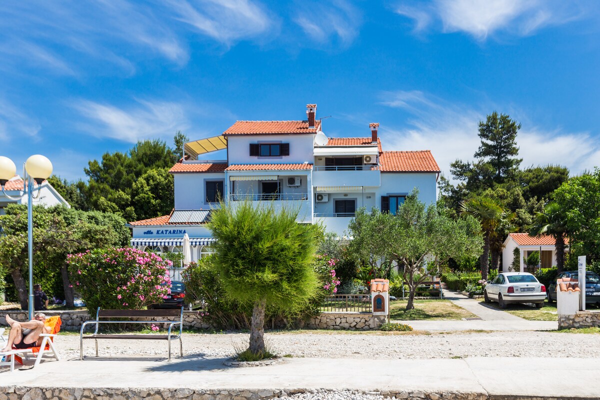 **New stone apartment near the sea with fantastic sea view**. Apartment 55m2 for 2 + 1guests . Spacious living room with sofa that becomes a double bed (smart TV, air conditioning)Kitchen (oven, dishwasher, coffee machine). 1. Bedroom (large double bed, wide wardrobe) with toilet (shower). The apartment has a private terrace (10m2) with amazing sea views. The terrace contains a table for 4 people.