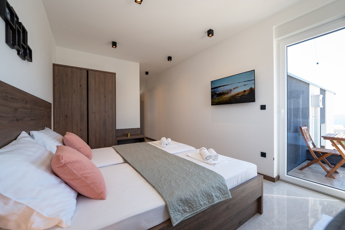 Luxurious room with bathroom, toilet, air conditioning and TV in the first row. Hot tub and saltwater pool are heated. An outdoor kitchen with barbecue area and seating, deck chairs and terrace right on the sea are perfect for enjoying the vacation. It is 50 m to Marina Pićuljan and supermarkets. Restaurants are a short walk away. E-bikes, S-U-P, can be booked at an extra cost. Yacht charter: AZIMUTH 62 Fly