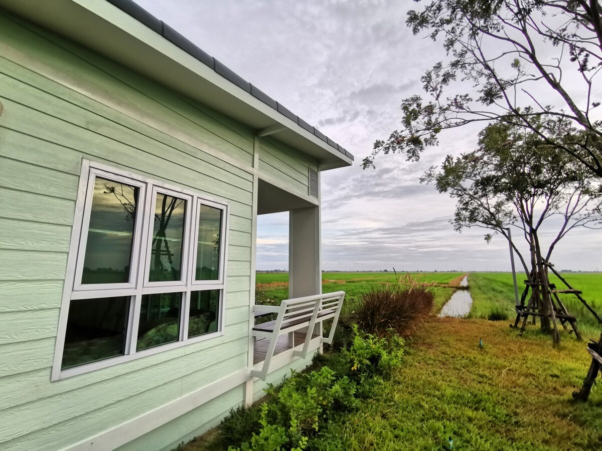 Only 1 hr drive from Bangkok, the cottage is in the middle of nature with endless panoramic view of the rice field that change with the seasons. This view captures an iconic traditional Central Thai way of life with the rice field. The cottage comes with free parking, two single beds that can be combined into 1 big bed, a pond to fish, a bbq grill and a binocular to look at birds as a perfect escape from the busy bustling city of Bangkok.