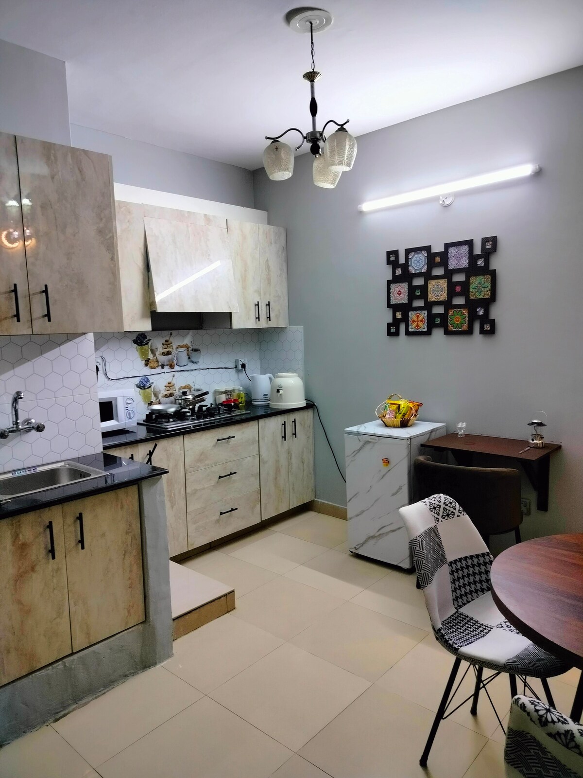 Our 1 BHK Orbit Penthouse in DHA Phase 5 is where urban chic meets celestial cool. Think: a glowing moon wall for those late-night selfies and a bold dollar-stacked art piece that screams "main character energy" Wake up to park views from your private balcony swing, binge your faves on the 50" 4K Smart TV, or cook up something aesthetic in the fully loaded designer kitchen. The interiors? Abstract, stylish, and made for the feed. Plus, you're right next to Lahore's hottest dining spots.