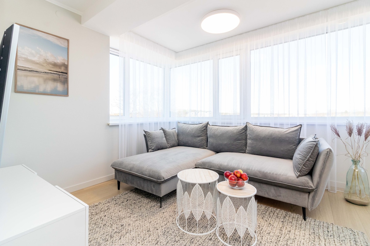Stylish 2BR Seaside Apartment with Panoramic Views Modern 2-bedroom, 2-bathroom apartment in the Elija complex, featuring stunning sea views. Just minutes from the beach and pine forest. • Panoramic windows with sea views • Fully equipped kitchen • Master bedroom + sofa bed • 2 workspaces with high-speed internet • 12km from Palanga center • Near scenic Ošupis trail Perfect for beach lovers and remote workers alike!