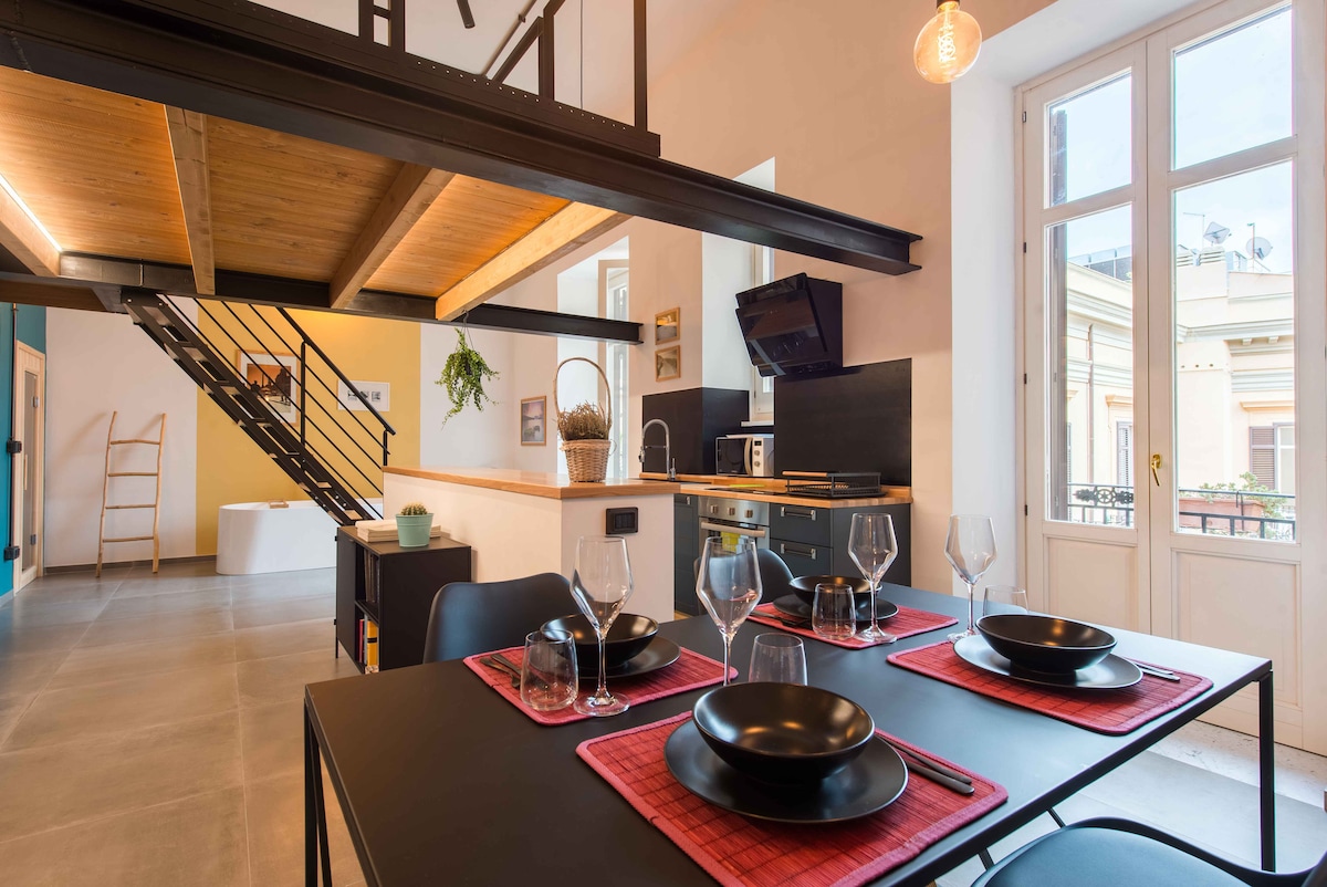 Large and bright loft in the heart of Palermo, on the third floor without an elevator of a 17th-century building, on a street that leads from Via Vittorio Emanuele to the Vucciria. The central location means that every point of interest is within walking distance, from Piazza Marina to the Cathedral, passing through the Quattro Canti. The large living room has a separate entrance, private bathroom, small kitchen and balcony overlooking Via della Loggia; it has a double bed on the mezzanine and a sofa bed.