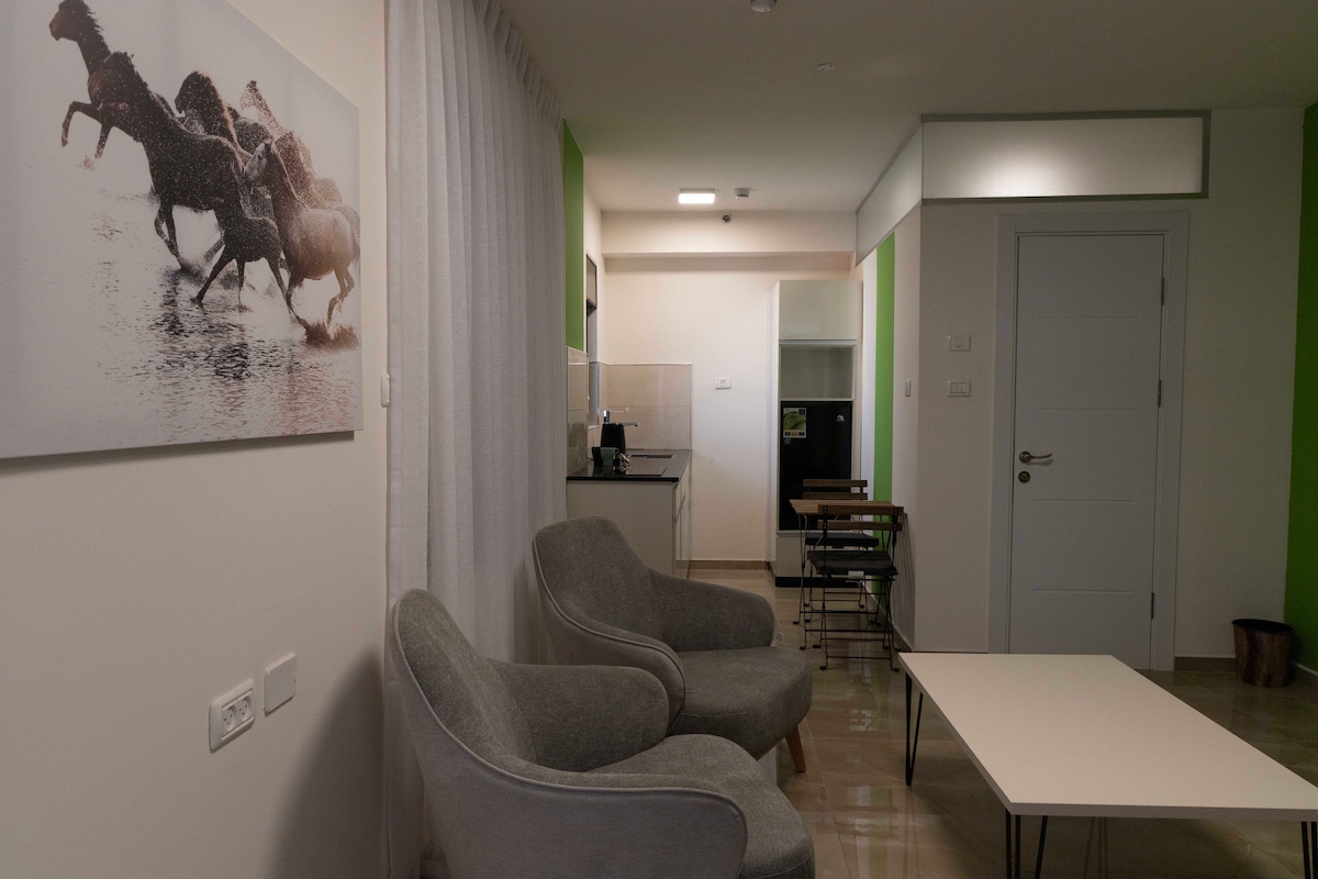 Green Breeze Apartment offers a fresh, calming stay with a green feature wall, soft lighting, and bright natural light. The bedroom includes two comfortable beds with crisp linens. A fully equipped kitchenette, cozy seating area, fast Wi-Fi, and modern bathroom provide all essentials. Ideal for guests seeking a clean, stylish, and tranquil stay in a central location.