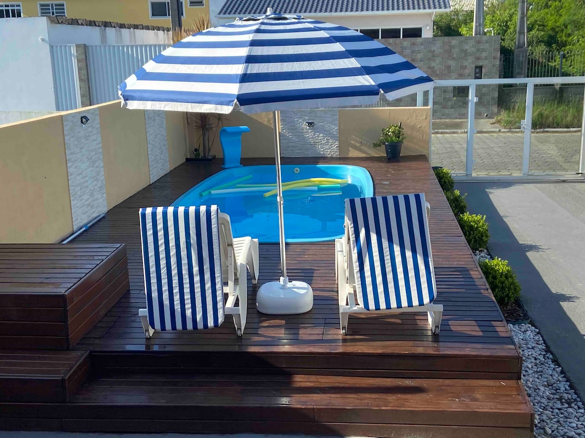 Beach House com piscina está a 600 metros da Praia do Meio - Pinheira, pronta para receber você, sua família, amigos. Aqui, encontrarão tranquilidade, aconchego, diversão e muito estilo. Cada canto da casa foi preparado com muito carinho e amor para melhor receber nossos hóspedes, e tornar a estadia inesquecível e especial. Venha se deliciar na piscina (5 X 3 m), fazer um bom churrasco, descansar, na rede se balançar, apreciar a vista, conversar. Ainda tem wi-fi, ar-condicionado nos quartos...