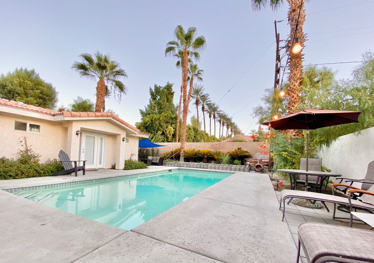 Enjoy a stylish experience at our centrally located Retro Casita (pool house) with its own private entrance, direct access to pool and massaging spa. Close to all necessities: Albertsons, Sprouts, Trager Joe’s, gas station, dry cleaners, hair & nail salons, restaurants, shops. Minutes away from upscale shopping, art galleries, restaurants & nightlife on El Paseo, McCallum Theater, Tennis Gardens, Acrisure Arena, Golf Resorts, Casinos, The Living Desert Zoo, *Coachella & Stagecoach Shuttle*!!!