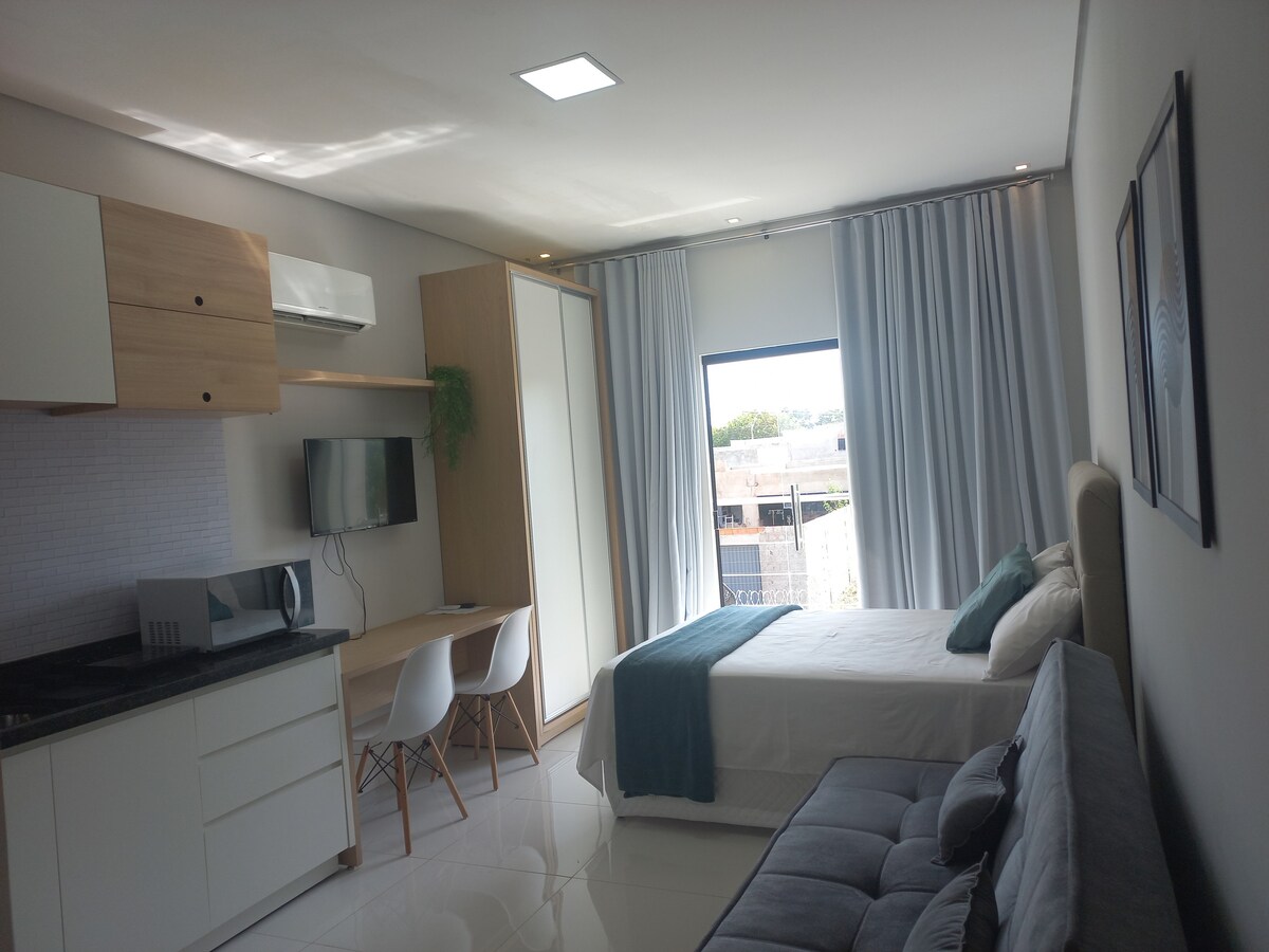 studio with high-end decor, designed for short and long stays. Perfect for couples, people traveling alone for leisure/ work, or a family with a child. Structure for up to 3 people. Ape is in a quiet neighborhood, 9 km from the airport, and 200 meters from the main colleges, ULBRA and Católica, close to the Assai wholesale store, easy access to downtown. It is in a townhouse with five studios, all individual, with a compact kitchen and basic utensils. Shared entrance.
