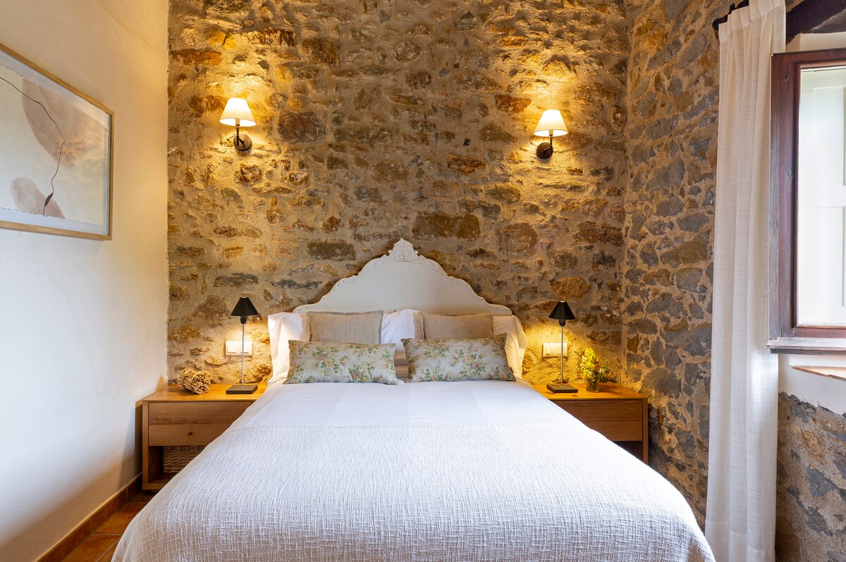 Unique accommodation in the heart of the Empordà, very close to the most beautiful beaches and villages in the area. Guest apartment with independent entrance from the street. With two floors, with kitchen, dining room and living room on the ground floor, and bedroom with bathroom on the upper floor. Garden, pool and barbecue are shared with the main estate (property owners) The space is suitable for two adults. Not suitable for children or babies.