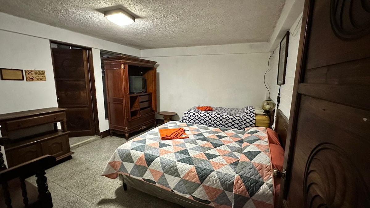 Hospédate en una amplia habitación con dos camas matrimoniales, ideal para 2 a 4 personas. Incluye desayuno gratuito en el rooftop con espectaculares vistas al lago y volcanes. Disfruta de atención 24 hrs, recepción dedicada y espacios modernos diseñados para tu comodidad. La habitación cuenta con cafetera con café y té, agua de cortesía, secadora y baño privado. Perfecta para familias o grupos que buscan confort y una experiencia única en Panajachel.