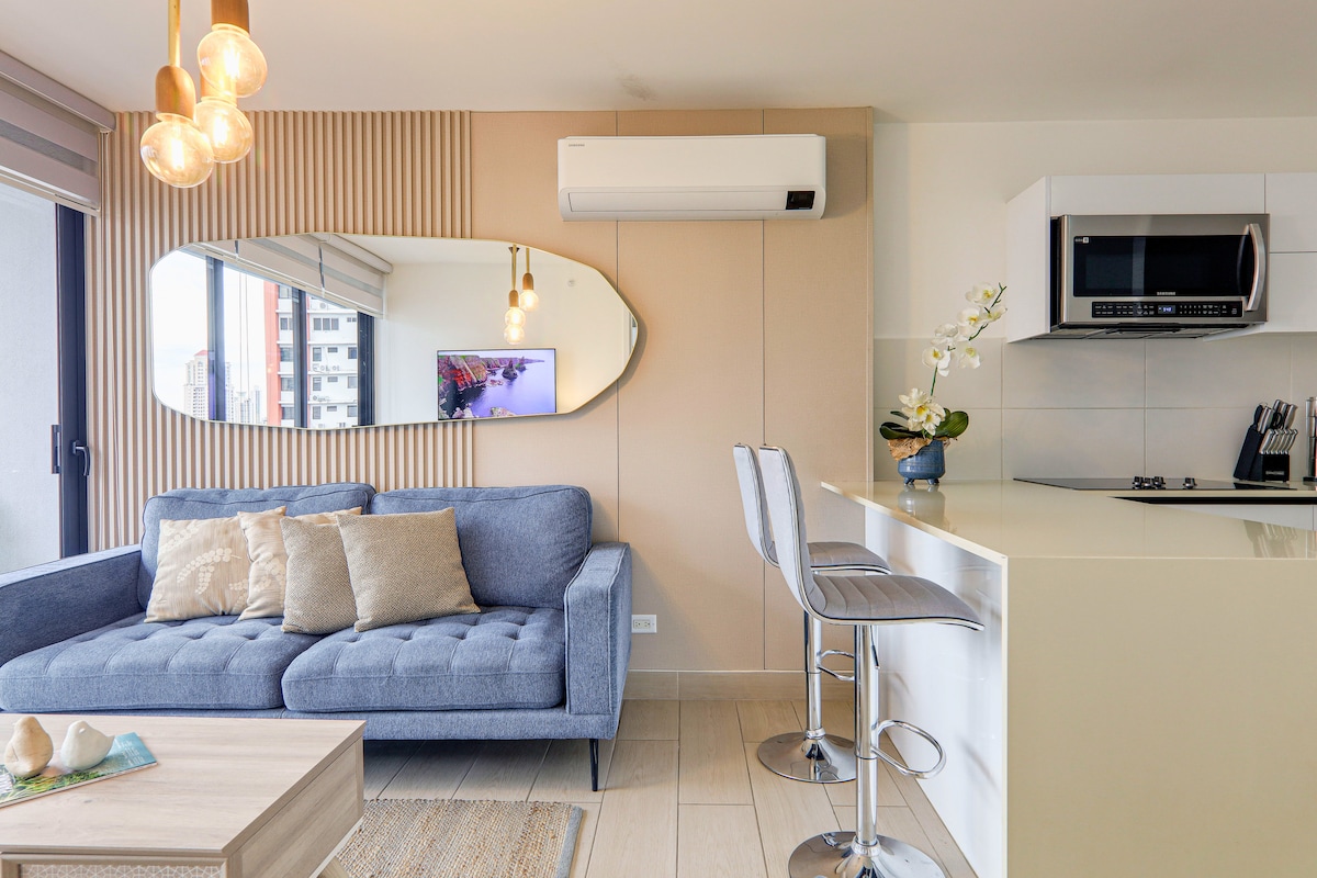 Welcome to your ideal stay in coast of Panama City. In The Sands, an exclusive high-rise on Avenida Balboa, this modern unit blends design, comfort, and location seamlessly. Enjoy premium amenities: a rooftop pool with breathtaking 360° views of the ocean and skyline, fully equipped gym, restaurants, and 24/7 security. Step right onto the iconic Cinta Costera perfect for morning jogs, bike rides, or sunset walks. You're just minutes away from Casco Viejo, the financial district.
