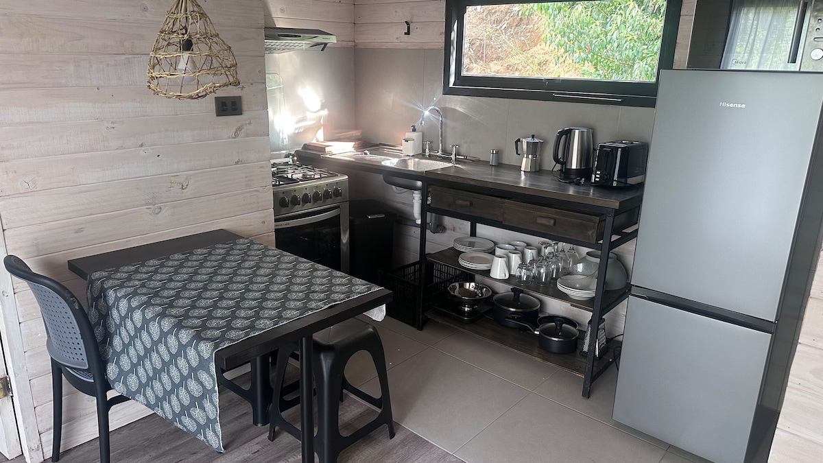 45 minutes or 32 km from Pucón, a rural cabin in the forest, designed for an experience of disconnection and simple life. Silence, birdsong, native trees, sun and mountain rain, with excellent WiFi. We run on renewable energy and conscious consumption, without urban luxuries. The heating is wood-burning, with the traditional southern rhythm. Ideal for relaxing, reconnecting with nature and living in the forest with respect; not recommended for those looking for city comforts.