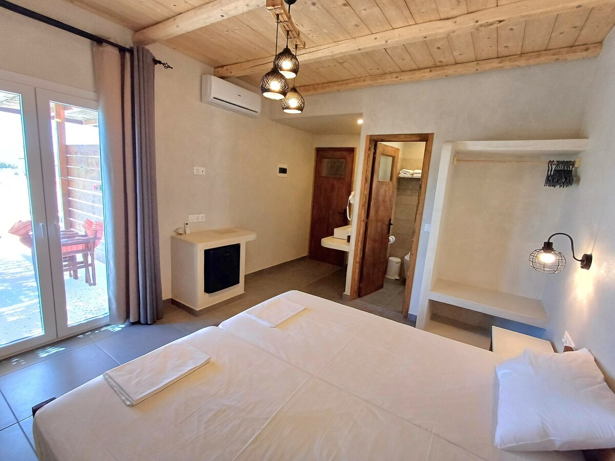 We have created a space that uniquely combines the elegance of the natural landscape, which is fully in harmony with the romantic view offered by the blue of the Aegean. The cottage has a built-in sofa & double bed that can accommodate up to 3 adults. Bathroom with shower made of wooden handmade details that fascinate. There is a fully equipped kitchen with a dining area for your autonomy and service. A terrace that invites you to an unforgettable island experience. Over 25 years old.