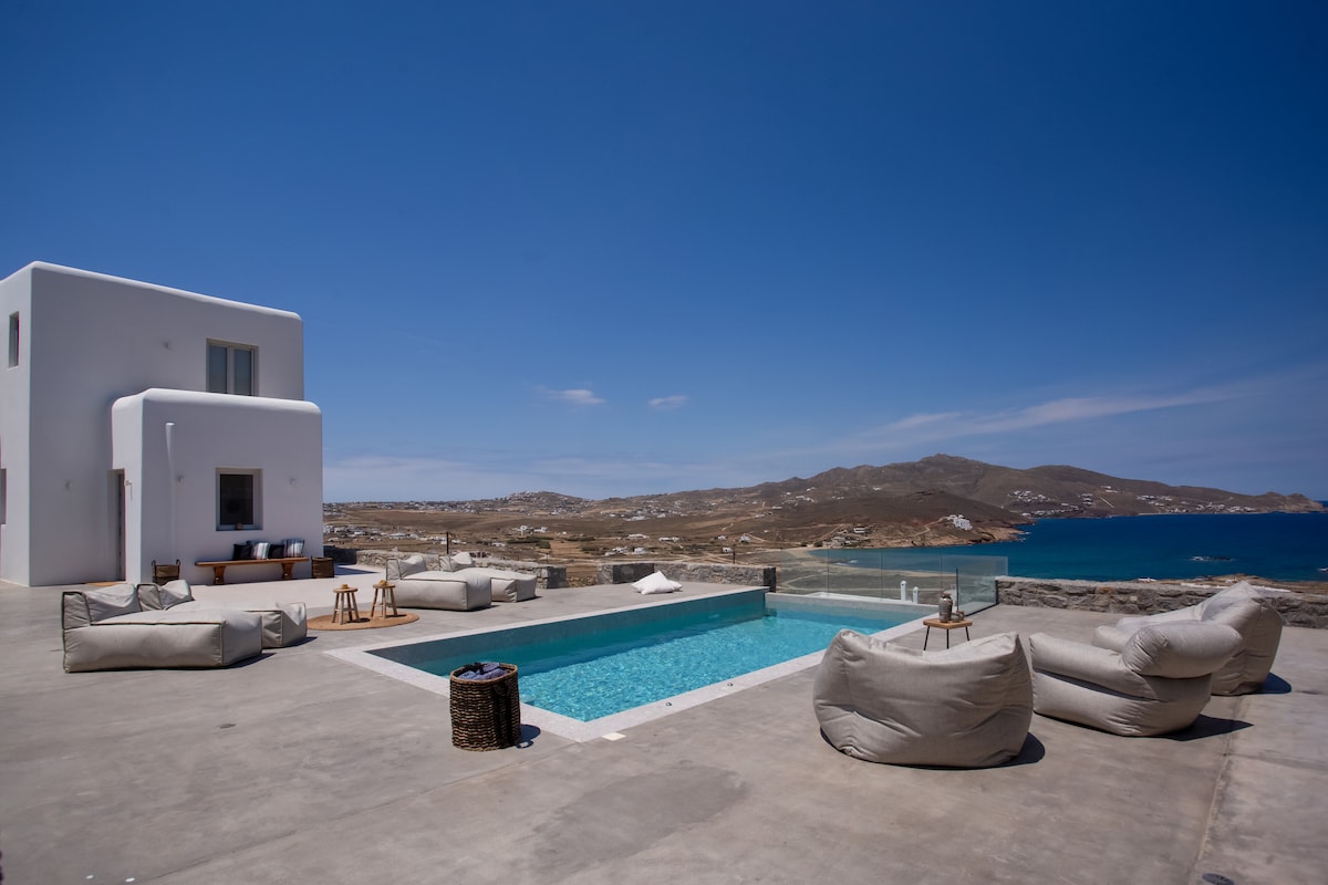 *THE POOL IS PRIVATE* This modern apartment has 2 bedrooms, 2 bathrooms and an outdoor private area with outstanding views of Mykonos, the Mediterranean Sea and Cycladic Islands. The interior was just renovated and everything is new. New apartment located 4 mins (walk) from Ornos Town & Beach and a 5 minute drive from Mykonos Town. 2 mins away (Walk) there is a bus stop taking you to Mykonos Town. Daily Cleaning included. Private swimming pool with panoramic sea views Private Parking