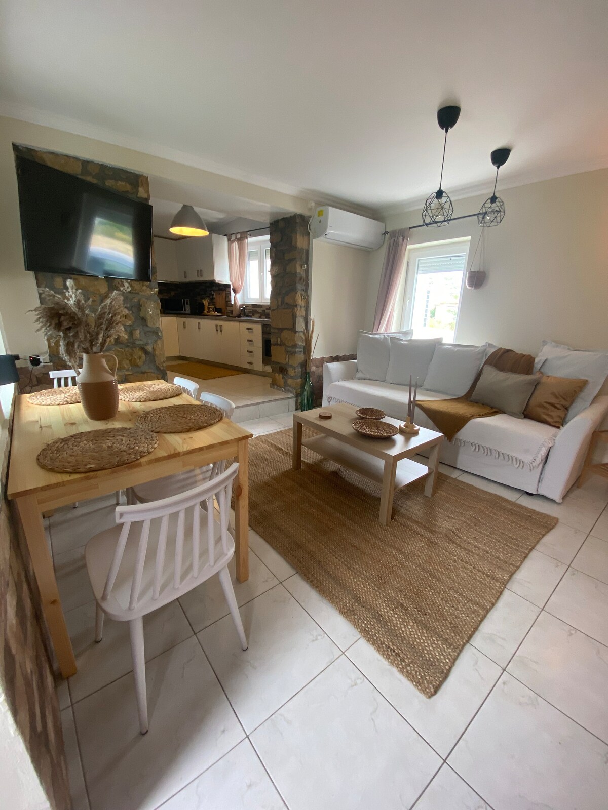 A fully furnished completely renovated stone house with wooden roof and a garden. It's brand new and ready for accommodation for family vacation and travellers, 4km far away from Moudros and 4km from Keros beach. There is a mini market and one traditional taverna at the village.