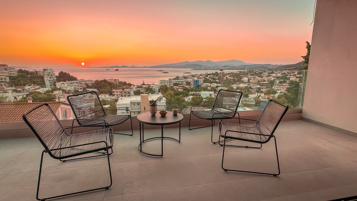 Panoramic views of the sea, close to the beach, centrally located next to public transport, restaurants, bars, cafes, super markets, cinemas and more. Only 20 minutes from the airport, close to Athens. Spacious & clean, 2 bedroom top floor apartment
