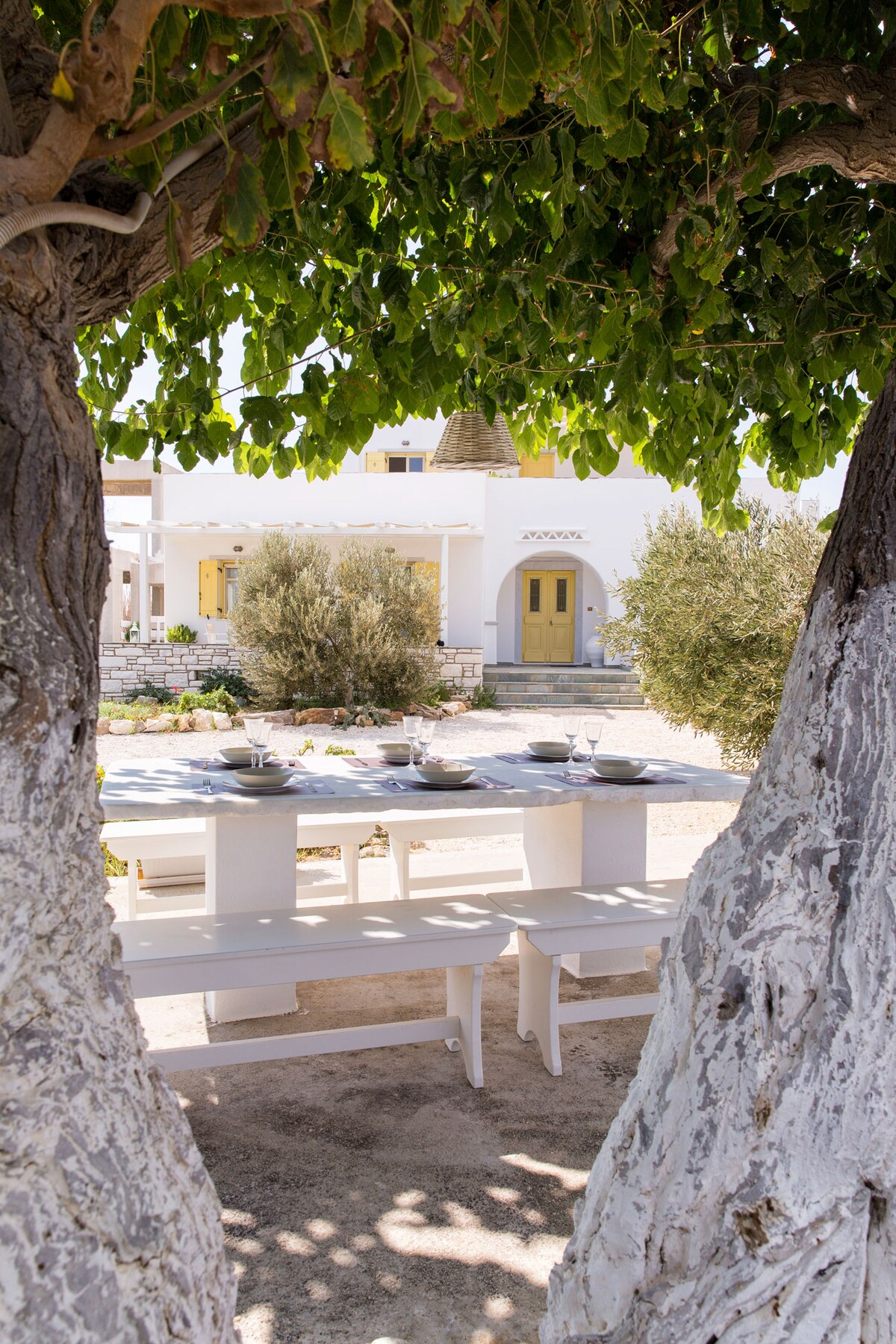 Right next to the charming village of Drios, this Paros' house enjoys views of Golden Beach as well as the sugar-cube houses all the way to islands floating on the sea. Spend days swinging in the long chair with a book, or plunging into the Aegean sea with the blue sky above. The long, covered terrace is home to sofas piled high with cushions and dining for the whole group – particularly atmospheric after sunset when the lanterns are lit.