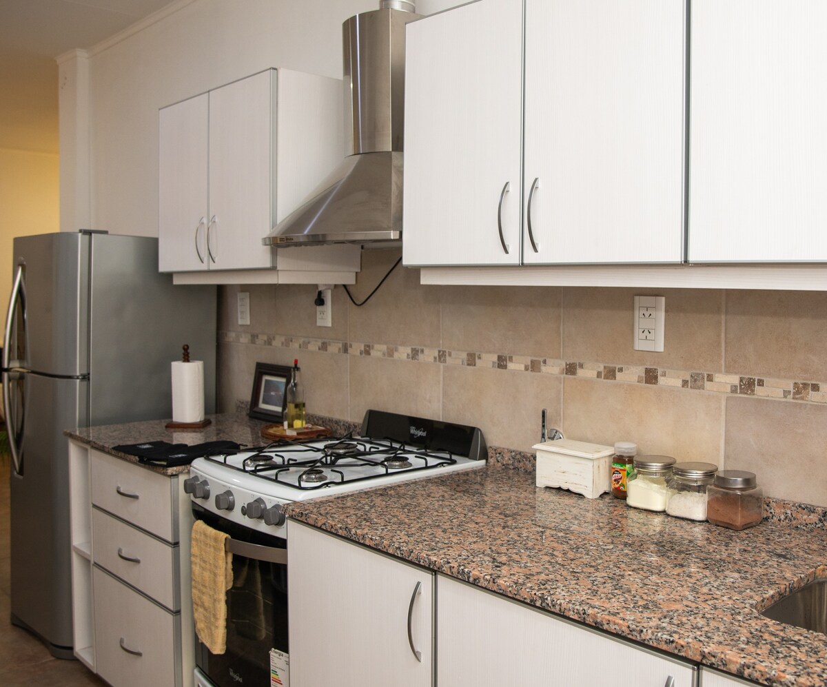 First-floor apartment, a space designed for rest and a homey feel, with a natural and holistic aesthetic, ideal for those seeking tranquility, privacy, and comfort. 9 blocks from La Costanera and 2 blocks from the Basilica de Guadalupe. Downtown in 10 minutes along the waterfront. Ideal for 3 people. Access via stairs. Bedroom with a double bed and a single bed, TV, and A/C; bed linens and towels are provided. Kitchen with microwave, electric kettle, toaster, refrigerator, stove, and dishes. Spacious, natural terrace.