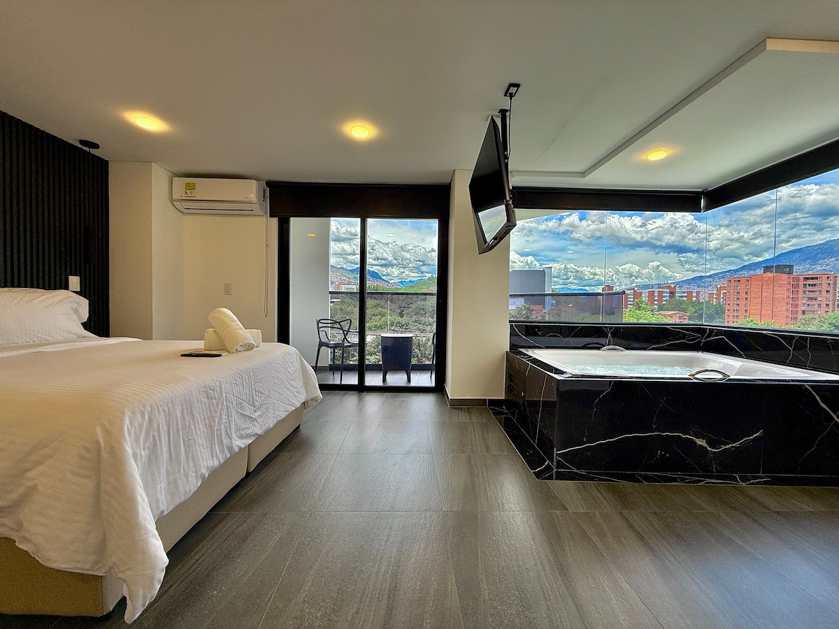 Experience Medellín in this stylish and exclusive open-plan studio near Parque Lleras with private jacuzzi, A/C, king-sized bed, 54" rotating smart TV, Netflix, workspace with high-speed Wi-Fi, fully equipped kitchen, washer/dryer, tea/coffee station, and black-out curtains. Enjoy amazing city views, superb interior design and finishes, gym, sauna, swimming pool, and on-site bars, restaurants, cafeteria, and art gallery — the ultimate exclusive retreat for comfort, style, and vibrant nightlife.