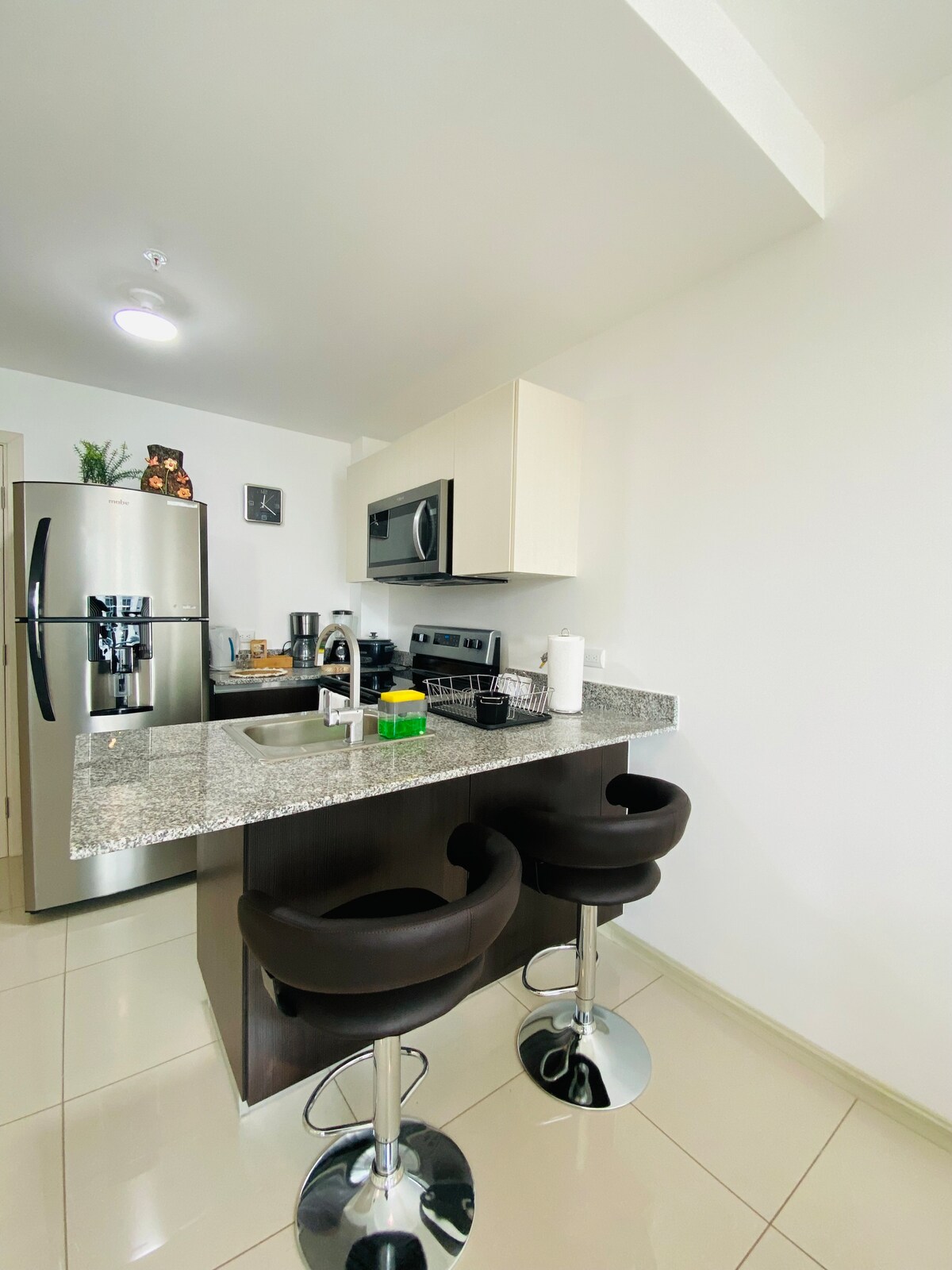 One-bedroom Apartment completely equipped with a Queen bed and a queen sleeper sofa. With A/C. Beautiful neighborhood in the heart of the capital. The apartment is on the 4th floor, the same as most of the amenities. You can use the steam room and go back to get a glass of water or grab a drink from the refrigerator while you cook something in the BBQ area.