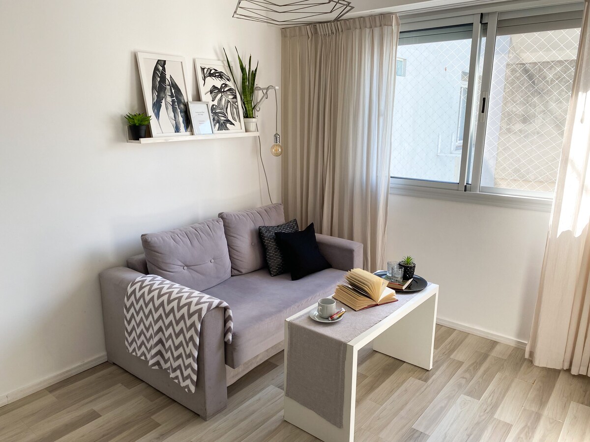 Modern Nordic-style apartment. Excellent location in the safest area of Rosario. 5 blocks from Urquiza Park, Paraná River, amphitheater and planetarium, 6 from the monument to the flag, 7 from the cathedral, municipality and historic center, 2 from Av. Pellegrini (with great gastronomic offerings and nightlife), 4 from the Faculty of Engineering. It has an equipped kitchen. Brand new furniture The sofa becomes a bed and corresponds to the 2nd bed