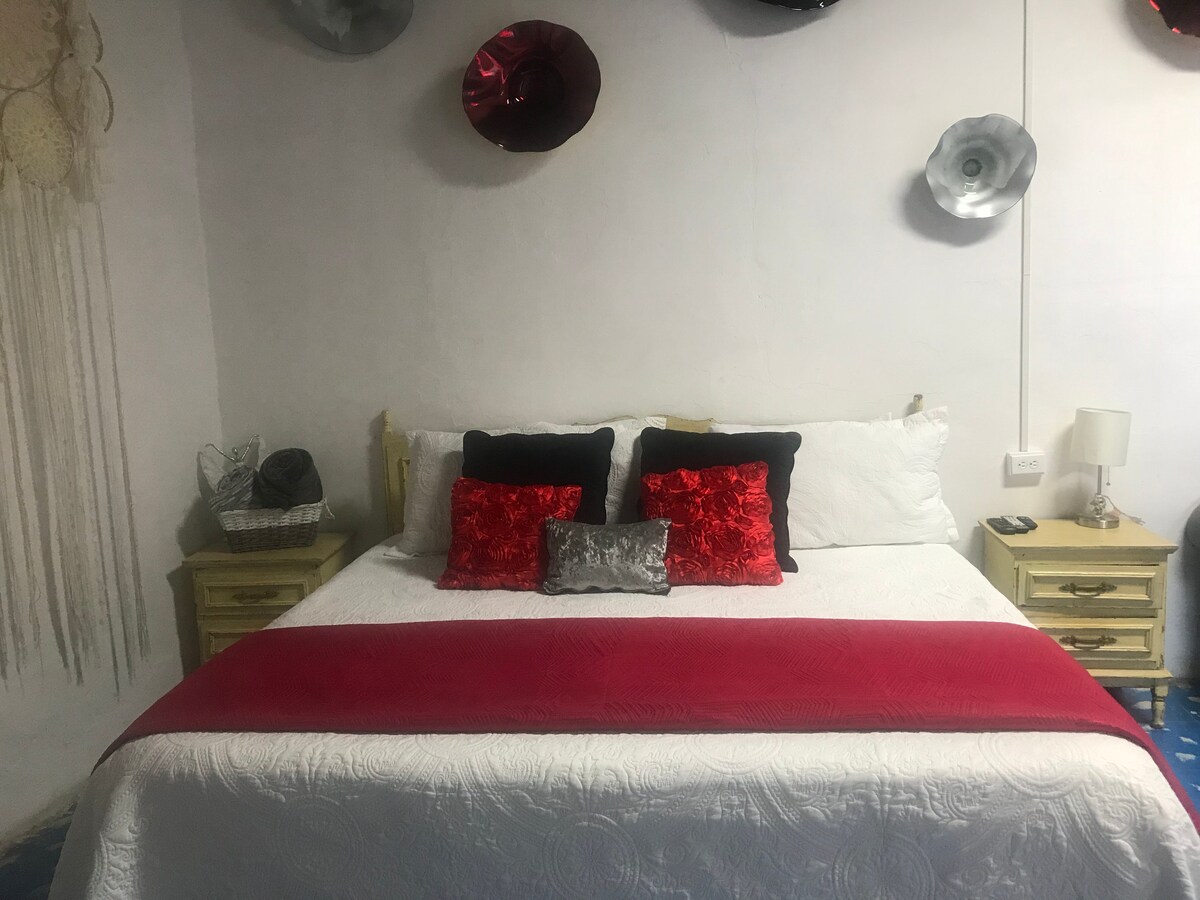 Beautiful separate room, air-conditioned, with private bathroom, which has a king-size bed, mini split climate, desks, lamps, TV, table, two chairs, coffee maker, dishes, cups and cutlery. It has access to a patio with a barbecue, refrigerator, sink, outdoor table and chairs. It is located one block from the main street and three blocks from Plaza del Reloj.