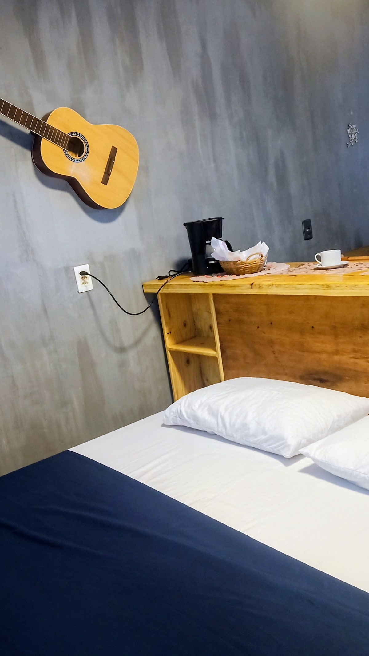 Suite with kitchen Sunset, with air conditioning, a queen size bed (including 2 pillows, pillowcases, sheet and over-sheet), extra double mattress on the mezzanine (including sheet). A spacious bathroom, Mini-kitchen with fridge, microwave, electric stove, toaster and coffee maker, (for simple preparations). It's at the front of the house on the 2nd floor with a deck overlooking the sunset. The window overlooks Barra Lagoon. 🚘 5 min from the beaches of Passo de Torres and Torres.🚍No public transportation🚙Uber available