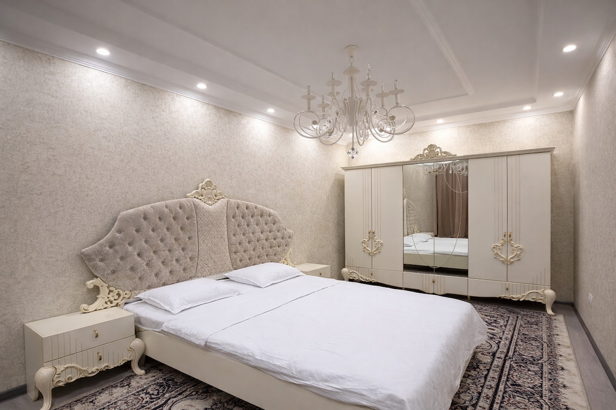 Enjoy a comfortable stay in the modern Smartcity building complex. Bedroom: Spacious and elegant with a luxurious upholstered bed, mirrored wardrobe, chandelier lighting, and soft neutral décor for a calm, hotel-like atmosphere. Refined classic design, premium furnishings and peaceful atmosphere — combining comfort, elegance, and convenience in one beautifully finished apartment. Perfect for couples, business travelers, or anyone who appreciates stylish living.