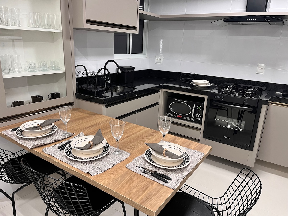 Enjoy an elegant experience in this well-located place. Here you will find everything you need, a unique place: New house! washing machine, all bedding, NOTE 4 bath towels, dishes and utensils, electric kettle, iron, dryer, charcoal grill, HERE WE HAVE NO RESTRICTIONS! Everyone is welcome. The house was decorated with every detail in mind for a very comfortable stay! AIR-CONDITIONED. (2 garage: 1 double bed,) 1 queen) 1 single bed with extra bed underneath