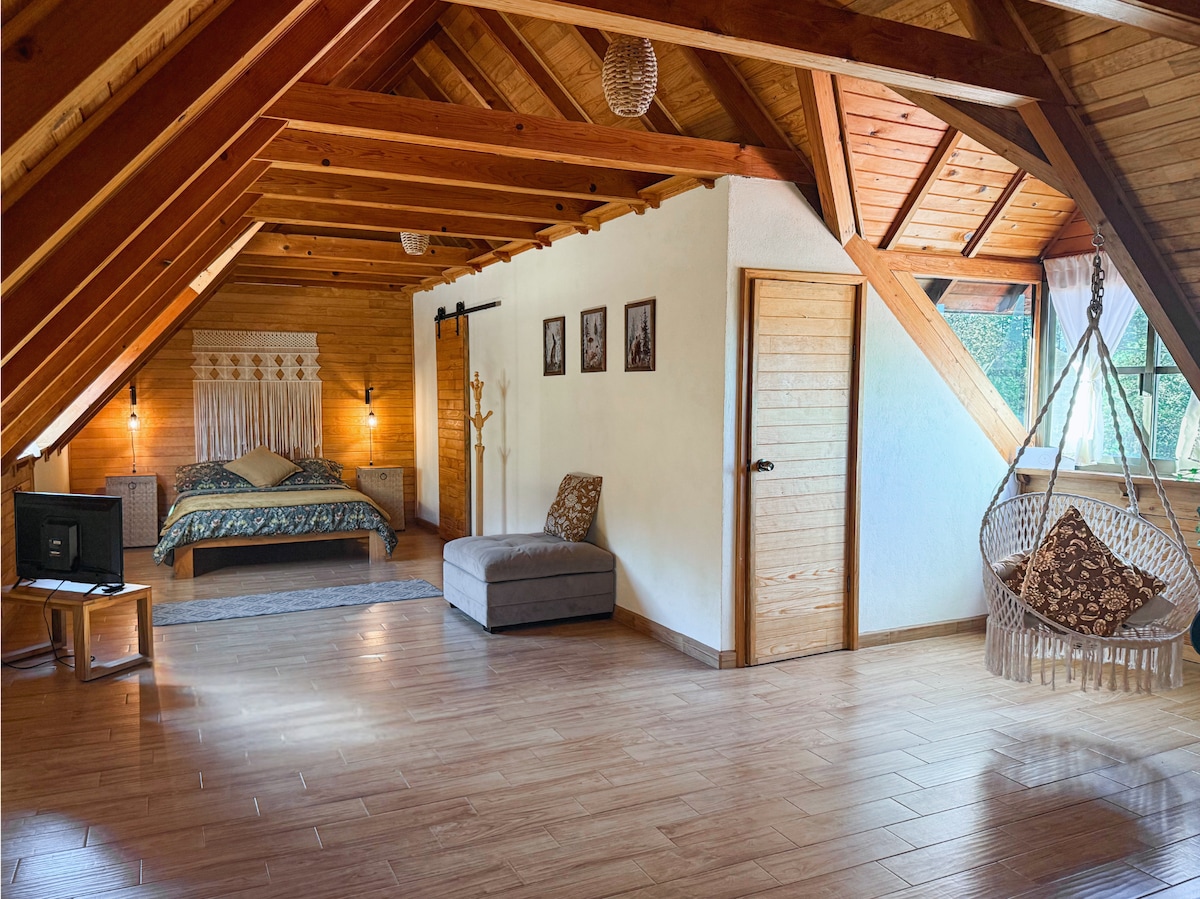Cabin just 10 minutes from downtown Pátzcuaro. With all the comforts and surrounded by nature that will make your stay an experience of rest and relaxation. It has a wood-burning fireplace, barbecue, and fire pit. Green areas with children's games and hammocks. The master bedroom has a comfortable king size bed and an indoor bathroom. Kitchen equipped with everything you need for your meals and a panoramic dining bar for you to enjoy during your meals or celebrations
