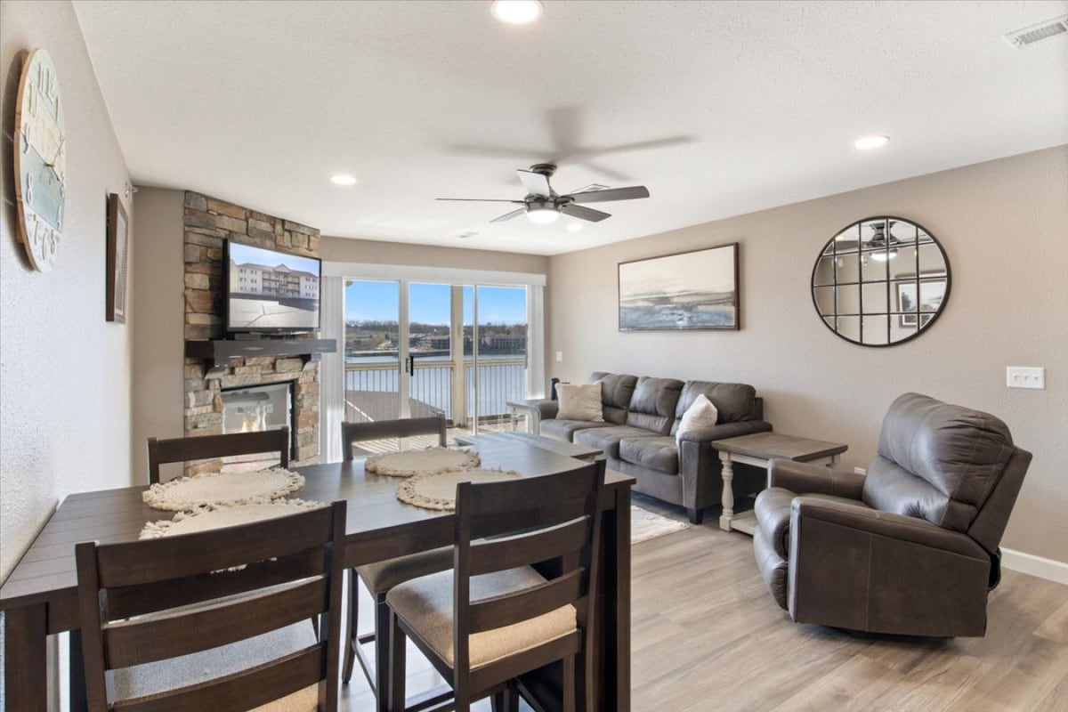 5-star condo with the best location by land or water, 17MM on the Osage Beachside. Golf, winery, fishing, restaurants, bars, shopping, you name it. You will be right in the heart of it Top floor lakeside, 2BR (plus a captain's loft), 2 Bath. Perfect for up to 6 guests. 3 outdoor pools (2 heated), tennis, pickleball & basketball court, and fish cleaning station are all on-site. Lakeside boardwalk. You won't be disappointed!