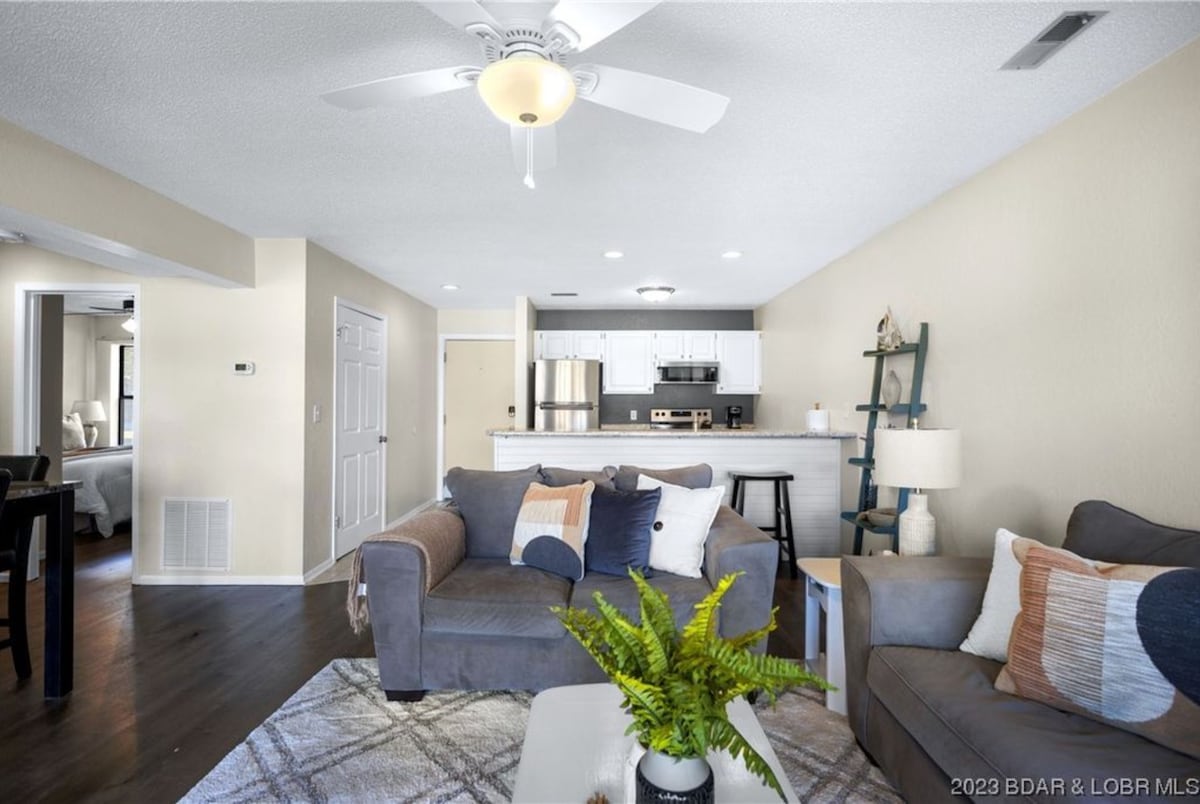 Enjoy the perfect getaway at this beautifully remodeled 3-bedroom, 2-bath condo at the highly sought-after Ledges Complex. Located at Mile Marker 20 in the Heart of Osage Beach, you are just minutes away from all the attractions you desire. This location offers an on-site boat slip, and all the amenities you will need to enjoy your stay. Spend the day lounging by the lake at the Ledges' exclusive sandy beach, grill out on the private patio, or drive minutes to Lake of the Ozarks State Park.