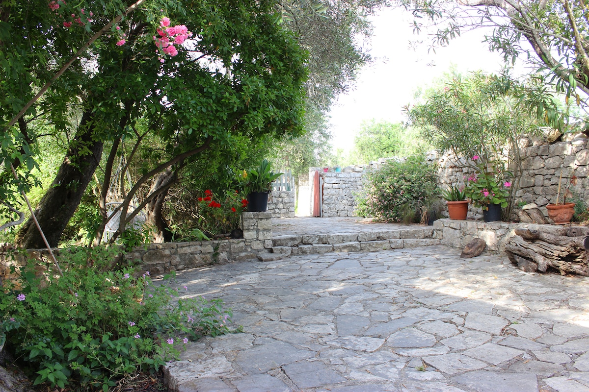 Traditional Greek stone cottage, located in the olive groves, less than 10 minutes walk down to Loggos village and a shorter walk to the beaches Marmari and Kipos. There is one master double bedroom and one smaller bedroom with bunk beds.