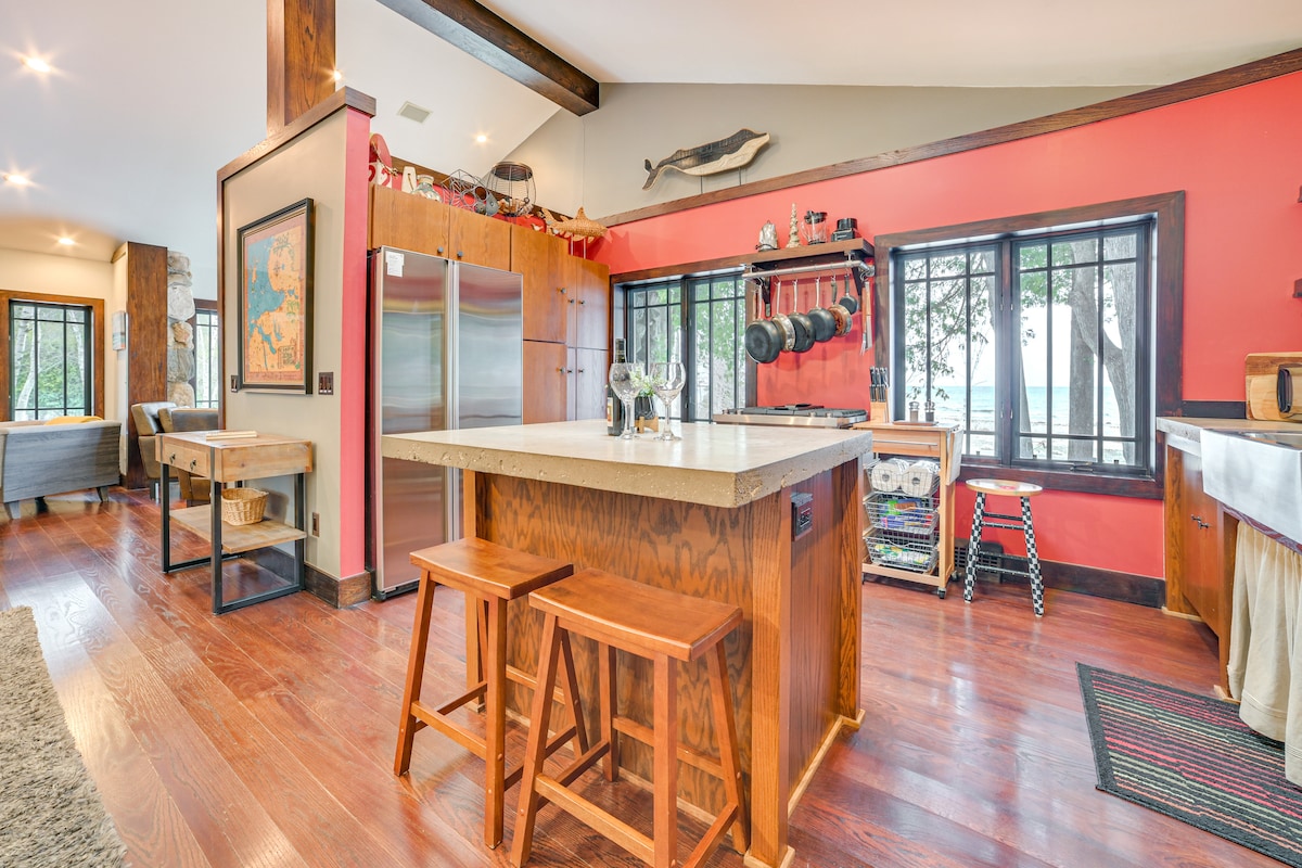 This cabin offers a perfect sense of tranquility, where you feel like nature and wildlife are your only neighbors. Forget your worries in this spacious and beautiful space. It has the feel of being alone on the lake, very secluded at the end of Wawaushnosh Drive. Rainey Reserve is just at the end of the road, and Smith Creek is just around the corner, a beautiful serene place to kayak. The kitchen is fully furnished.
