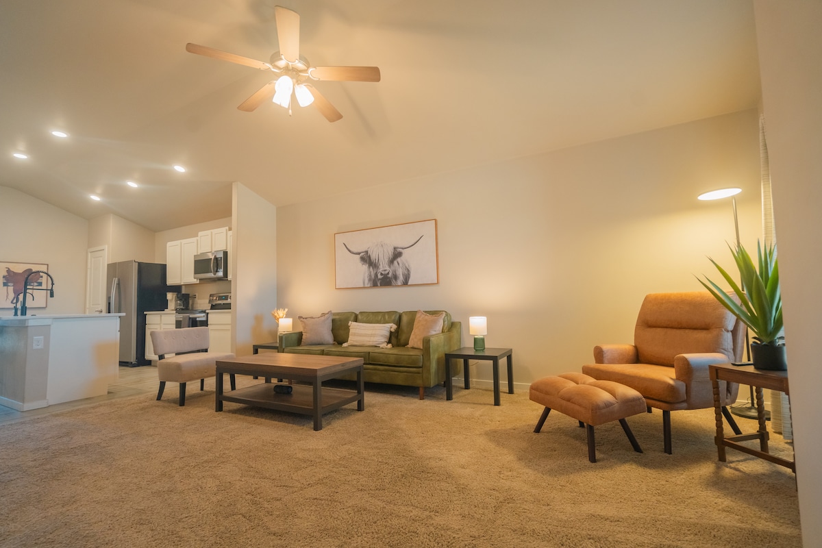 Rustic Ridge combines modern design with black and white accents throughout. The bright living room is bathed in natural light, and the fully equipped kitchen and spa-like bathroom offer ultimate comfort. The bedroom includes a queen-size bed with ample storage, while the loft upstairs features another queen bed and breathtaking views of Palo Duro Canyon. Outside, enjoy a private patio with a bistro table and grill. Located just minutes from the park entrance, it’s the perfect canyon getaway.