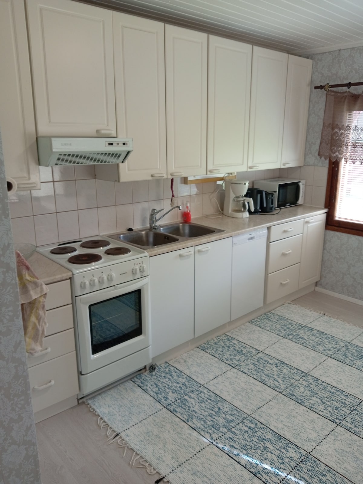 Peaceful villa by the lake. Area: 80 m2 indoors + large terrace and outdoor sauna Number of beds is 6 separate beds. Rooms: Kitchen, living room, 3 bedrooms, hall, bathroom + sauna Facilities: fireplace, fridge/freezer, electric stove and oven, dishwasher, microwave, coffee maker, kettle. On the property, there is another beach sauna.