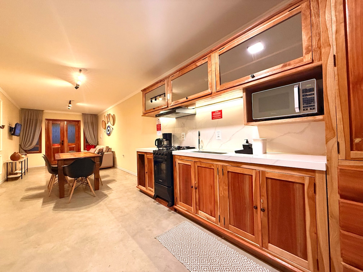In the Pukuá cabin you can fall asleep counting the stars, because there is a skylight on top of the bed. In addition to the bedroom with space for a home office, you can relax on the sofa (or hammock) in a super cozy room. Board games, Netflix, Prime, Disney and Star FREE? We have them! The kitchen is equipped with everything you need. Our Cabana mixes the rustic with comfort and every detail has been designed to make your stay as pleasant as possible. Spacious and private bathroom.