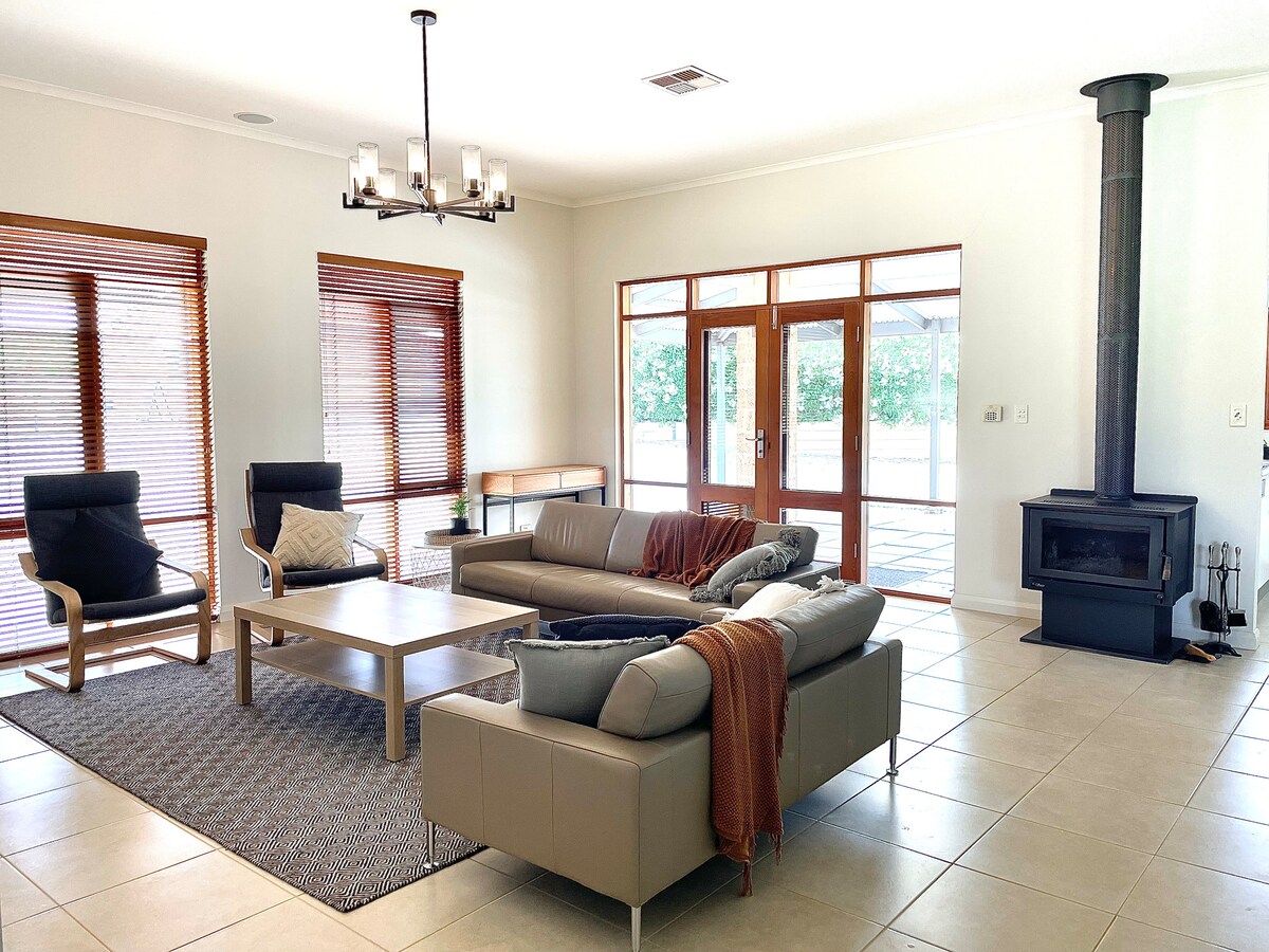 Stylish Vineyard Accommodation. Idyllic setting. Perfect entertainer for 8. Rates are for 8 guests / 4 bedrooms (1 king and 3 queen beds). Blend of character and modern. Wide decks for relaxing. Inground Pool. RC Ducted aircon. Firepit. 5 acres to meander. 2 mins drive to town, restaurants, RieslingTrail & world class wineries. Ample parking. Family friendly and ideal space for children. Pets on request. Amazing for star gazing on a clear night. The perfect place to relax!