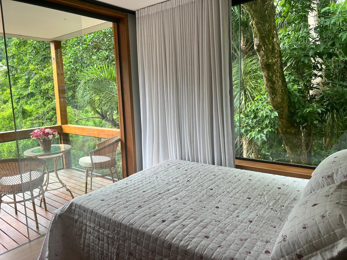Brand new, quiet and charming space. Suite with queen-size bed, reading lights and fragrant bed linen. A kitchen with a water filter, a two-burner cooktop and utensils for preparing meals. Very nice balcony, with a small table, comfortable hammock and swimming pool a few steps away. All done with affection to welcome people of good taste in search of tranquility. The serenade is provided by the symphony of the Atlantic Forest of Ilhabela, one of the most beautiful islands on the Brazilian coast.