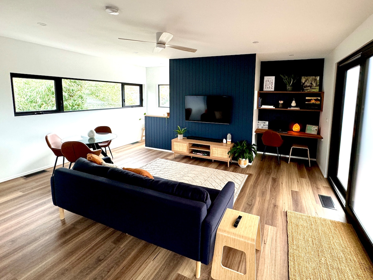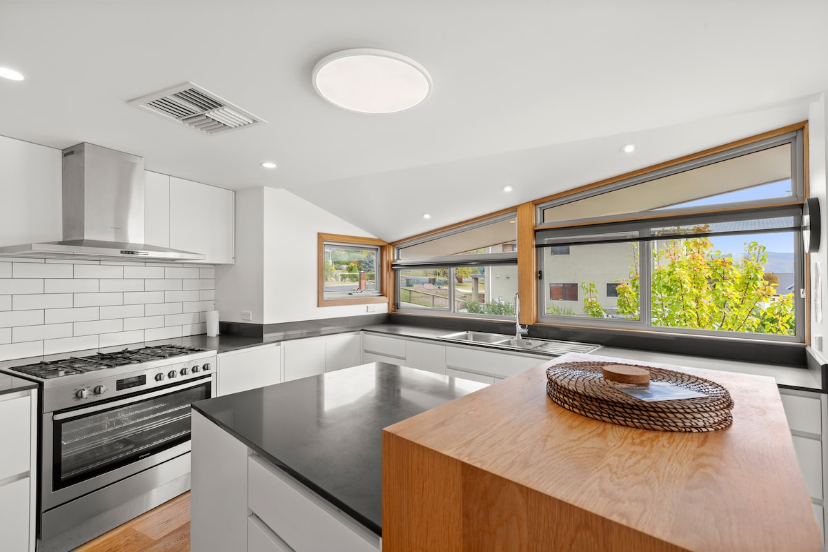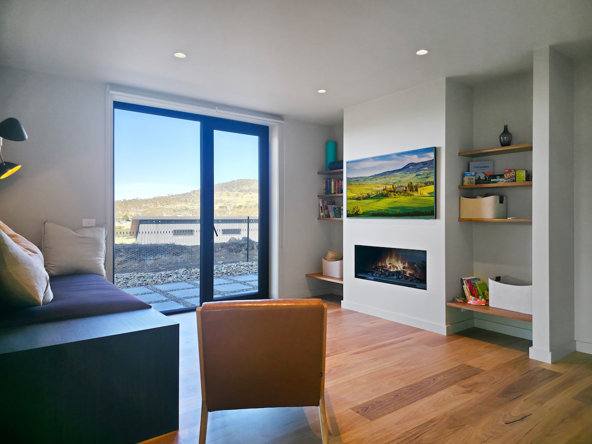 Escape to our luxurious Snowy Mountains retreat, blending designer style with cozy comfort. Relax by the log burner on cold nights with underfloor heating for toasty toes, or soak up summer evenings on the spacious sun deck. Amenities include a chef's kitchen, 65" Smart TV, outdoor bio-ethanol firepit, king beds and a garage for all your gear. Perfect for unwinding after your alpine adventures, The Lodge is located just 35 mins from Thredbo and Perisher ski resorts and 7 mins from Jindabyne.