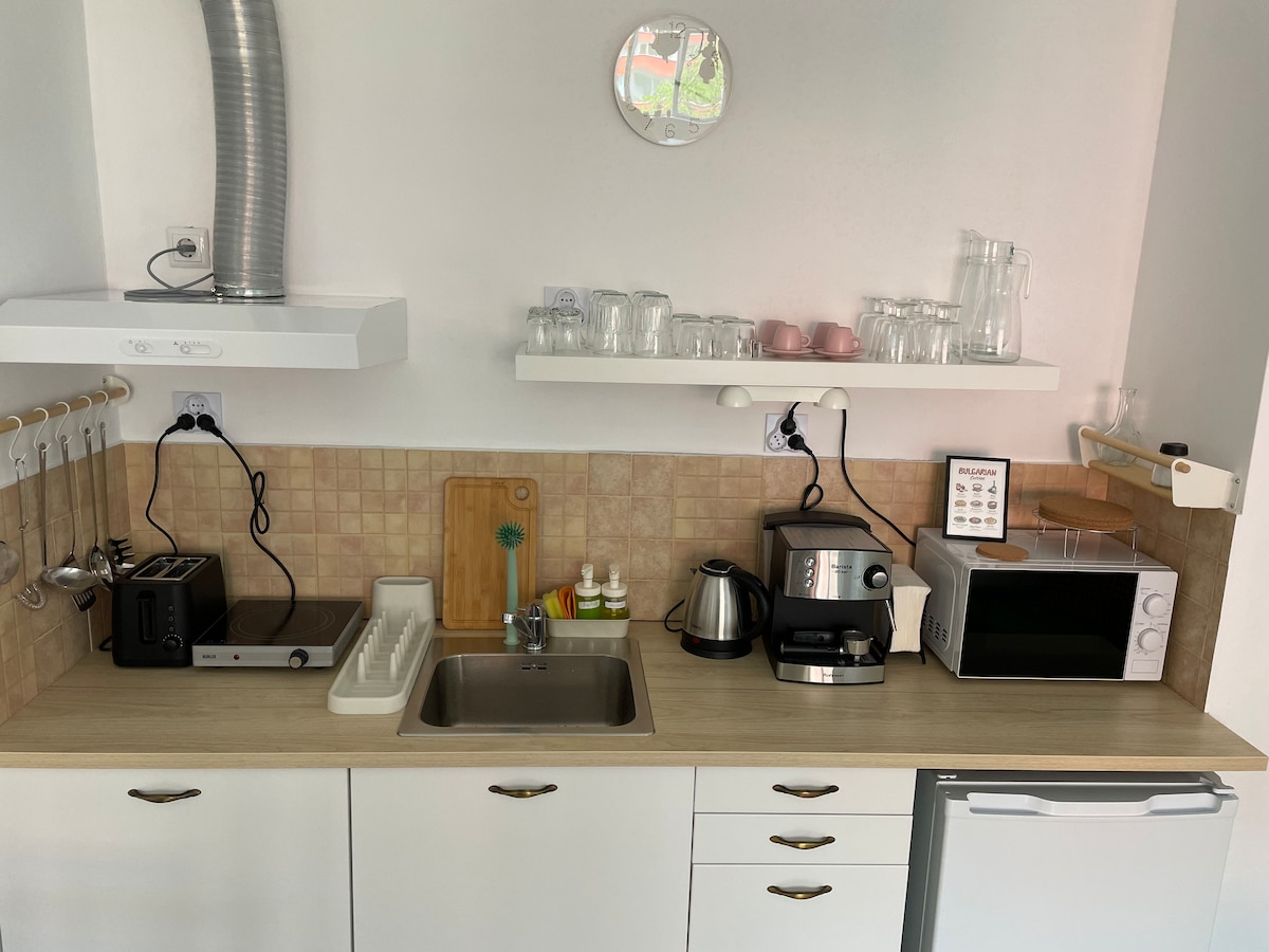 Brand new 2022 apartment, located 5 min away walking distance from New Bulgarian University. It has everything you need for your short or long term stay - big queen bed, dining area, modern bathroom with toilet, fully equipped kitchen, wardrobe with hangers, WI-FI, TV, etc. It is perfect for a romantic getaway, business travels, solo travellers, students and everyone who enjoys modern designs combined with coziness and quiet atmosphere.