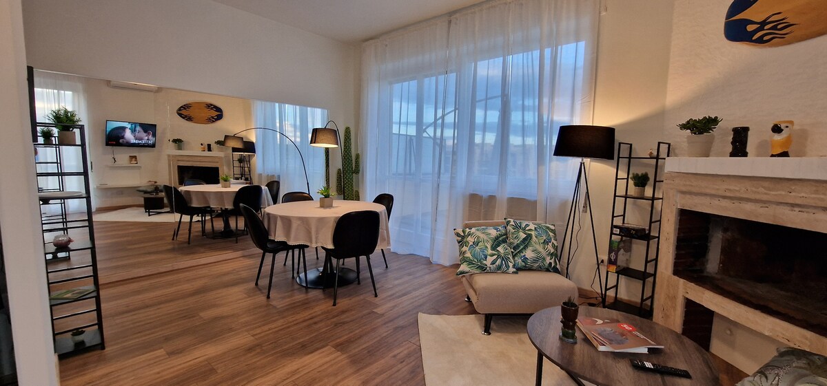 Troverai un AMPIO LOFT di 100 mq. luminoso, una splendida vista panoramica, soggiorno open space stile moderno e VINTAGE con cucina a vista con penisola, 2 camere di cui un'ampia matrimoniale, bagno con finestra e TERRAZZO ideale per rilassarsi al tramonto. Finemente arredato e curato, fibra wi-fi e Netflix, ARIA CONDIZIONATA in tutti gli ambienti, perfetto per coppie, famiglie, professionisti e chi cerca ogni comodità. Vivi un soggiorno indimenticabile tra cielo e mare.