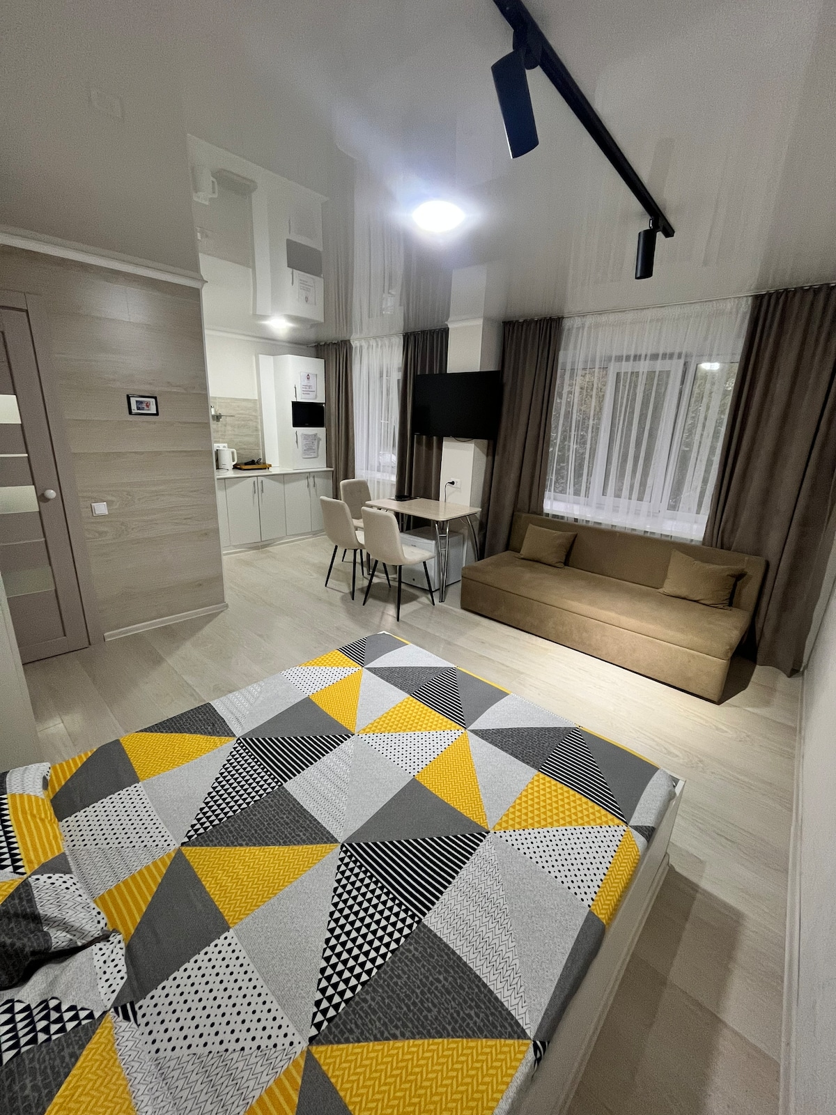 A 1-bedroom luxury apartment in the city center. The location is very central. Staying in the apartment will give you vivid emotions and you will want to come back here again. The apartment is equipped with all the necessary household appliances, a double bed with an orthopedic mattress (mattress with coconut filling), a projector, unlimited WIFI, as well as a sofa for a comfortable stay.